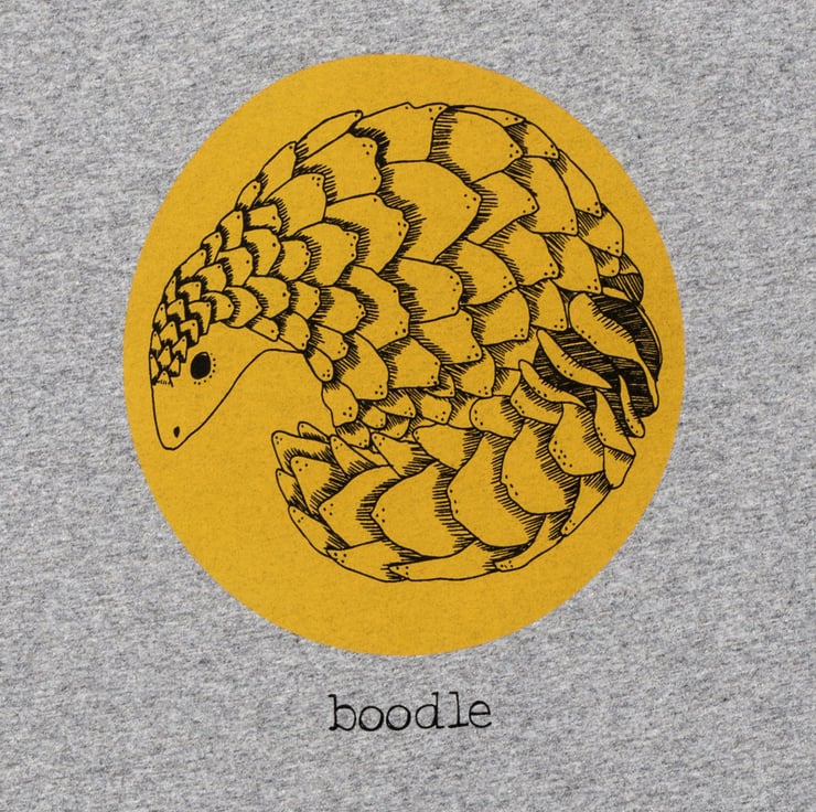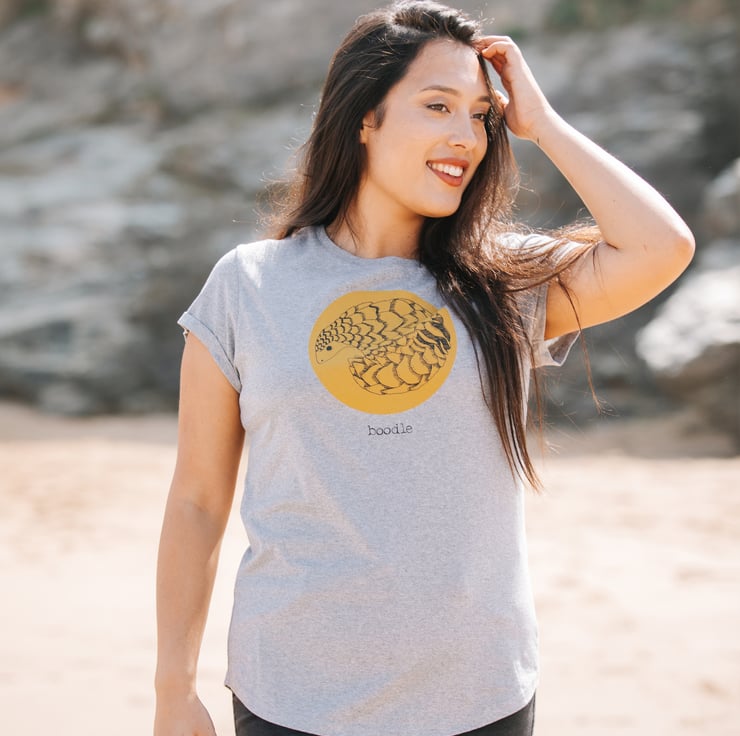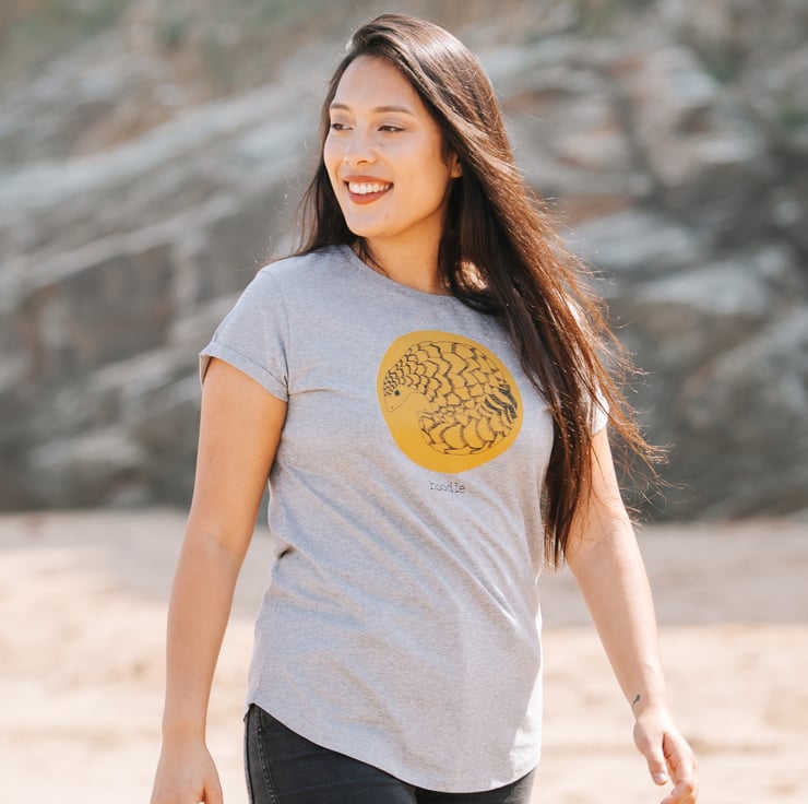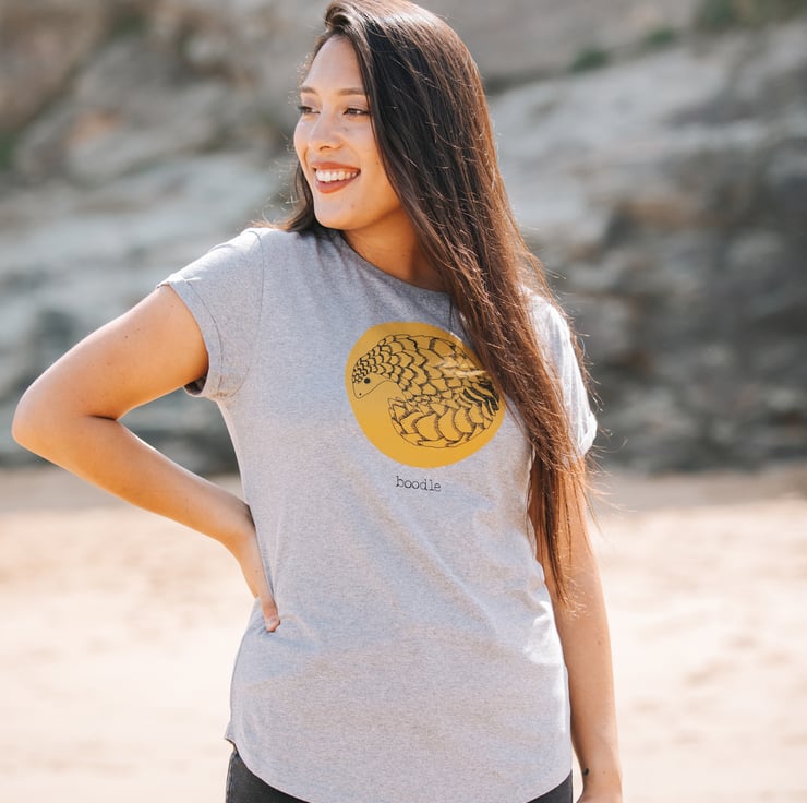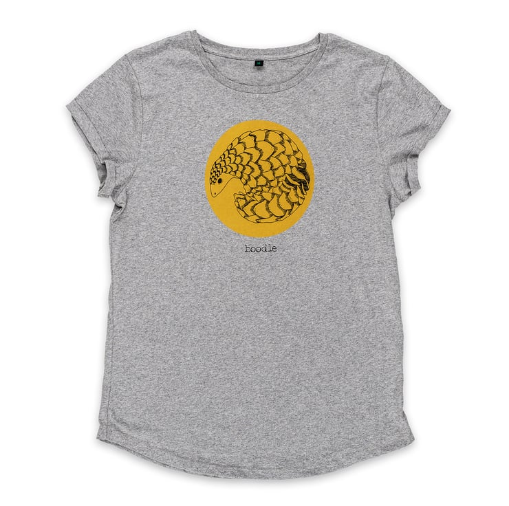 A lovely melange grey organic t-shirt featuring an illustration of a pangolin against a mustard yellow circle.