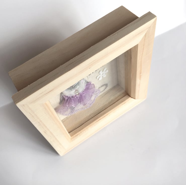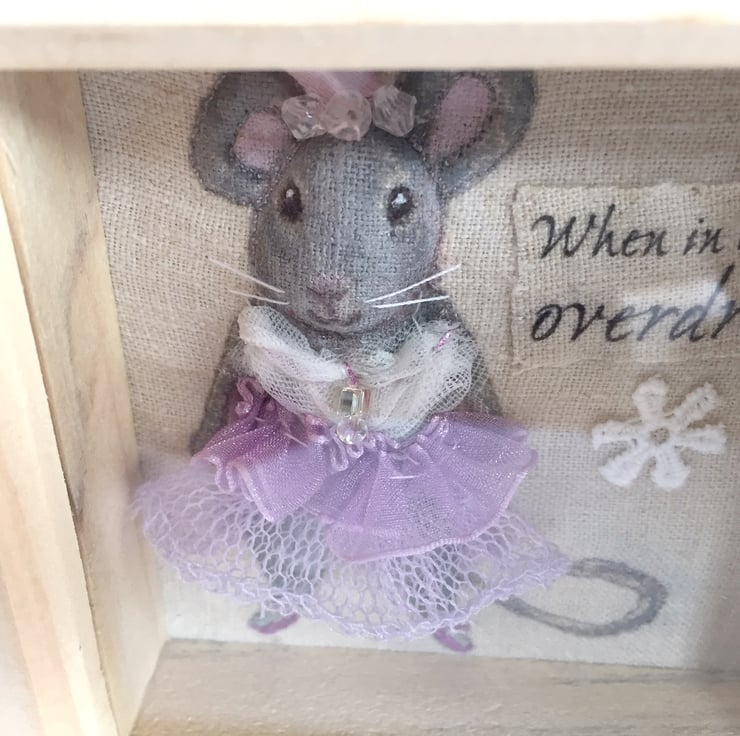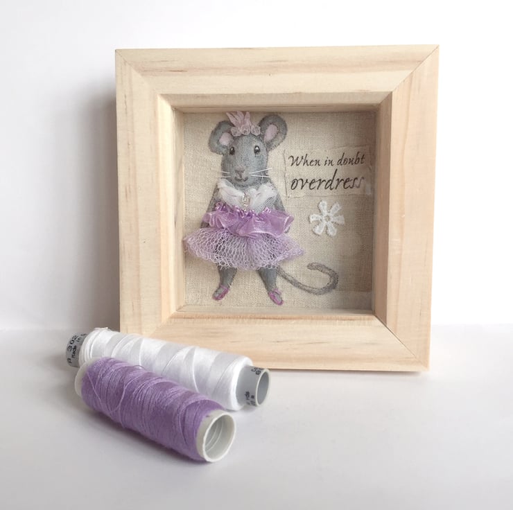 Small 3d dressed-up, fabric mouse, handmade of embroidery, scraps and ribbon in a charming little wooden frame
