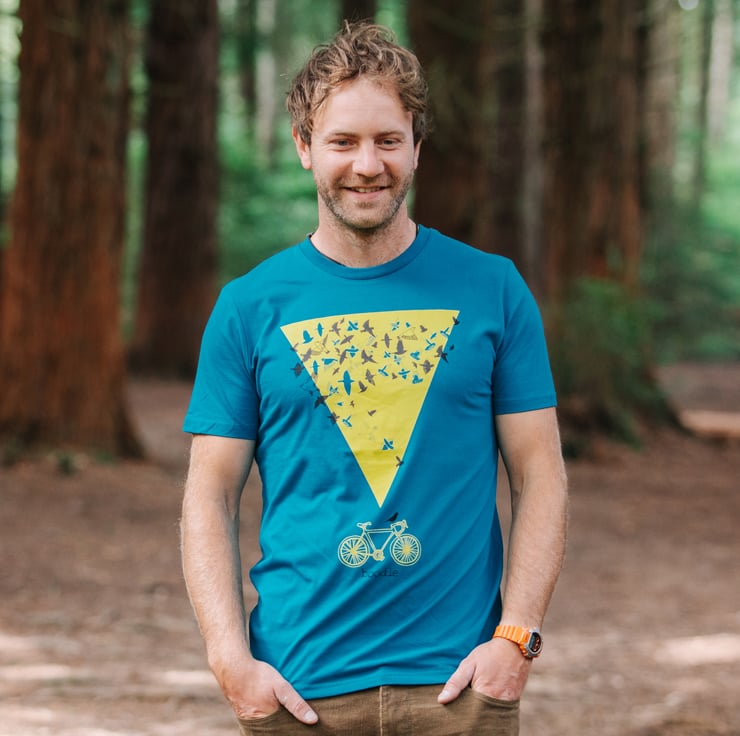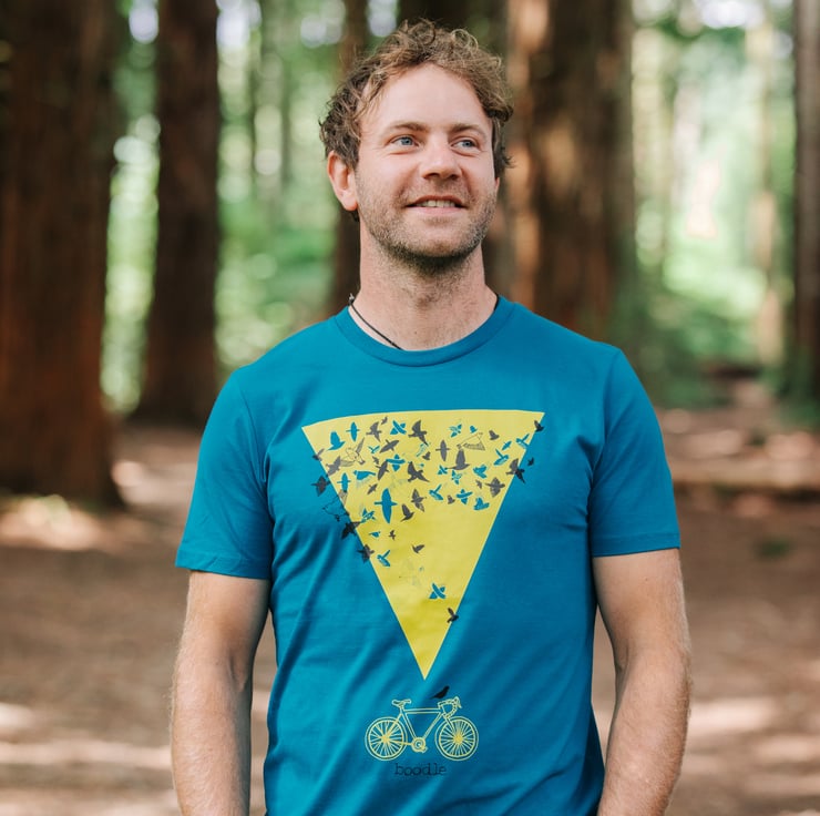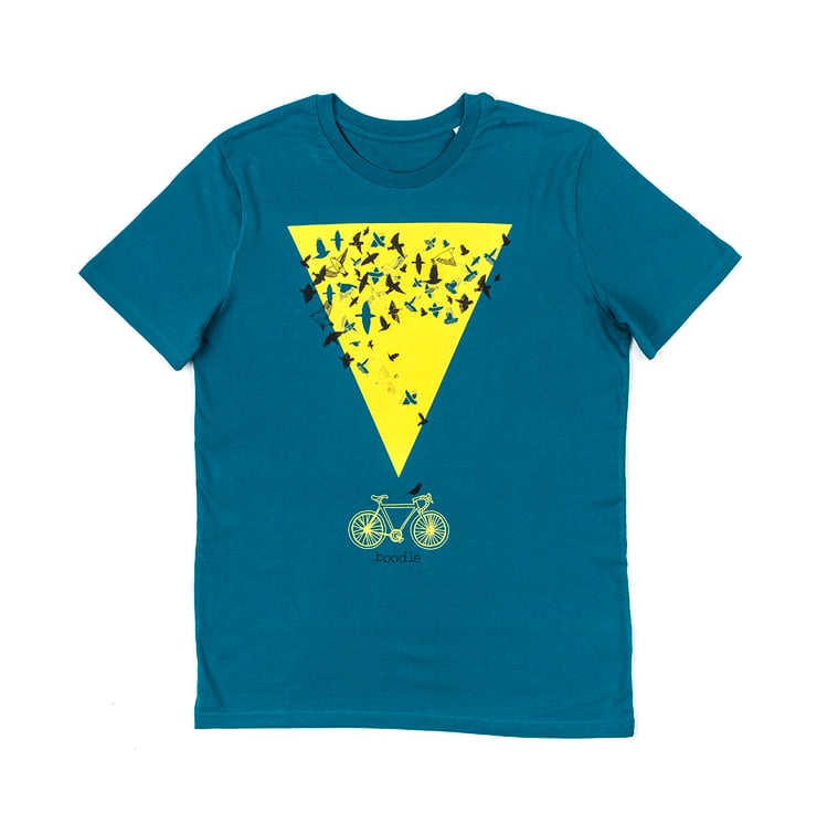 A lovely organic turquoise T-shirt featuring a beautiful illustration of a murmuration over a bike, set against a striking yellow triangle.