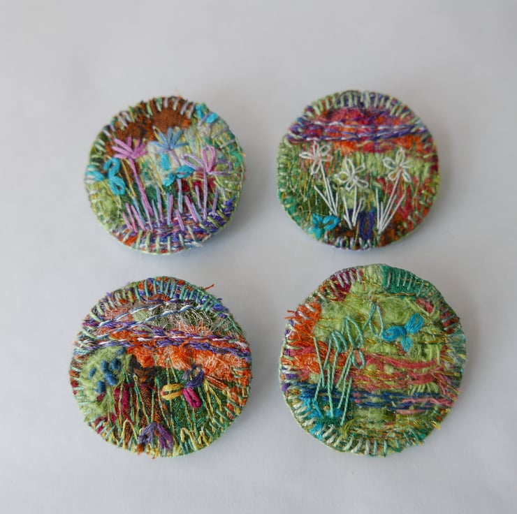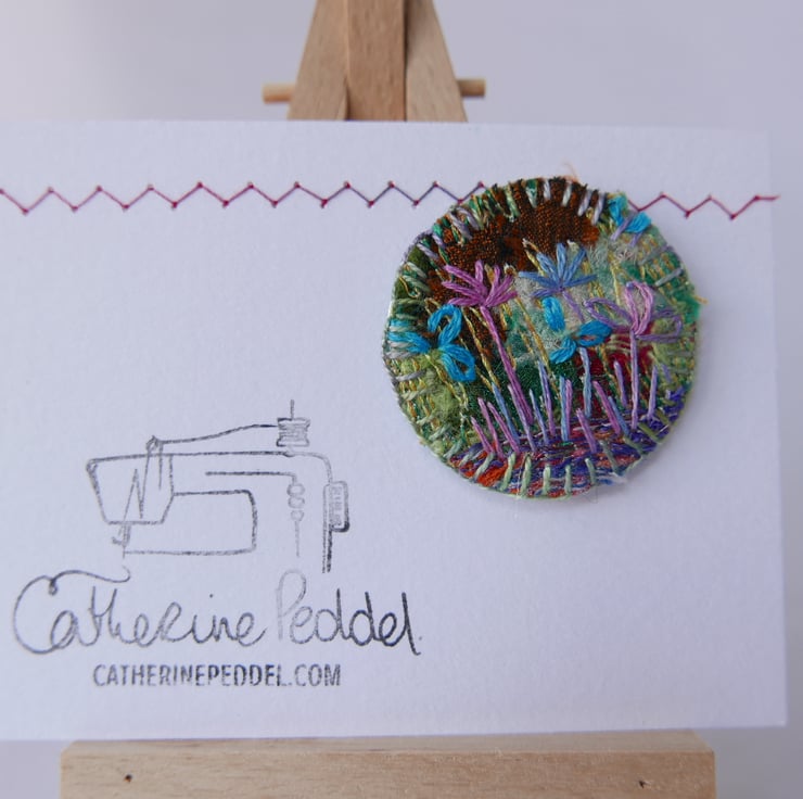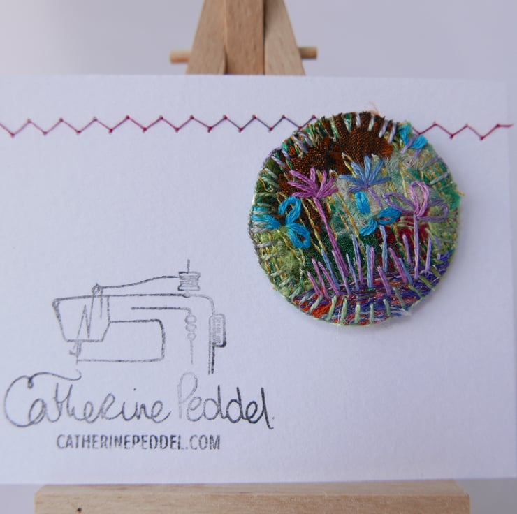A handmade merino felt brooch with wild flower embroidery. Beautiful watery colours. Delicate pink and blue flowers enhance the background of greens and golden browns.