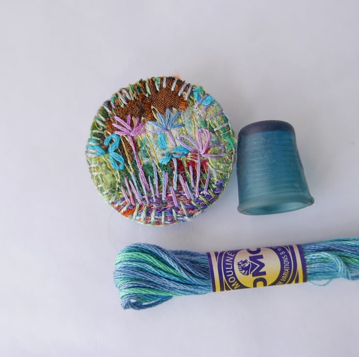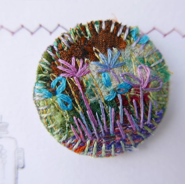 The brooch is edged in blanket stitch with a pale sage green thread.