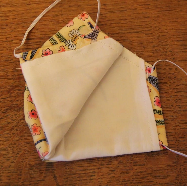 A really comfortable two-layer structured cotton face covering, comprising a gorgeous bee and dragon fly design outer layer and a white cotton lining. The cotton lining is not attached to the outer layer at the sides, so an extra tissue or gauze can be inserted.