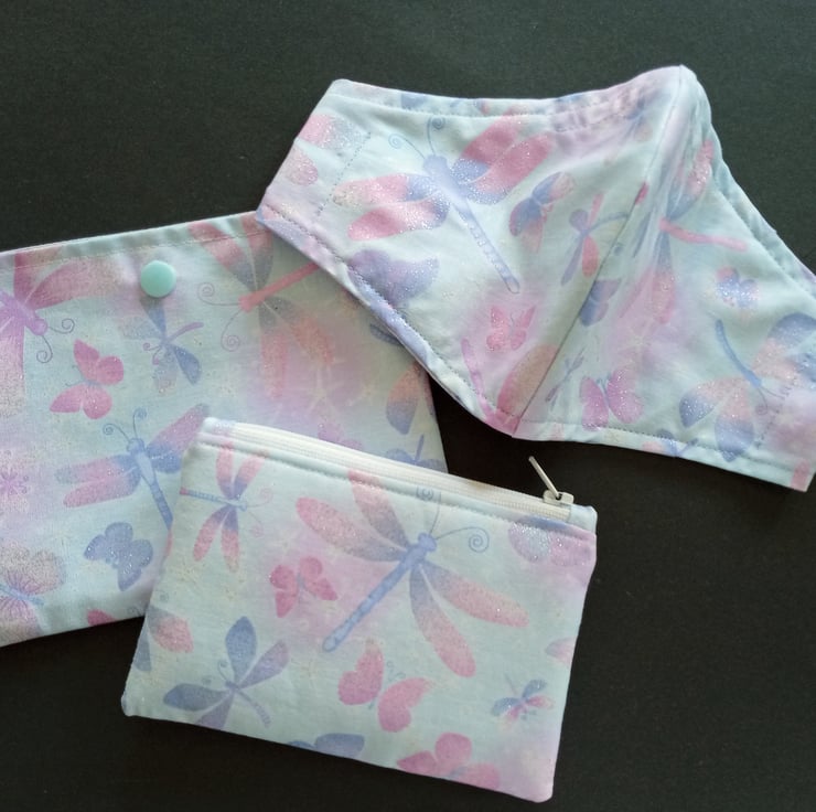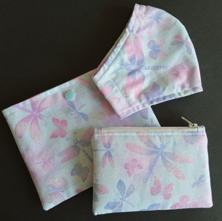 A face mask and pouch to store your mask while not in use, as well as a zipped pouch for storing a mini bottle of hand sanitizer (60ml). You could also use it to store your card if you just wanted to pop to the shops.
