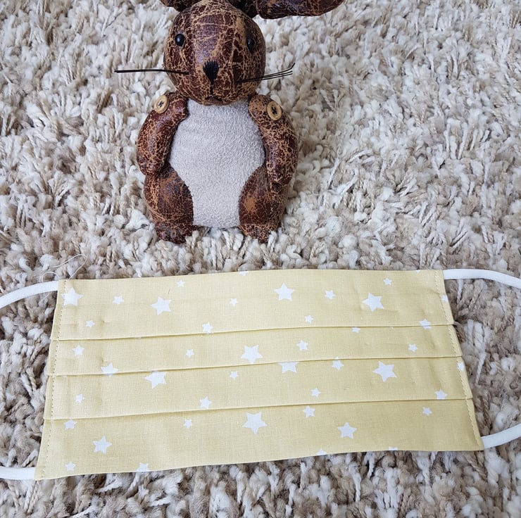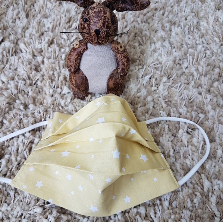 Adult face covering/mask made from a star print on yellow cotton. The face mask is made with 2 layers of cotton forming an inner pocket for a filter (not included) and is fastened over the ears with 2 loops of elastic and a toggle adjuster.