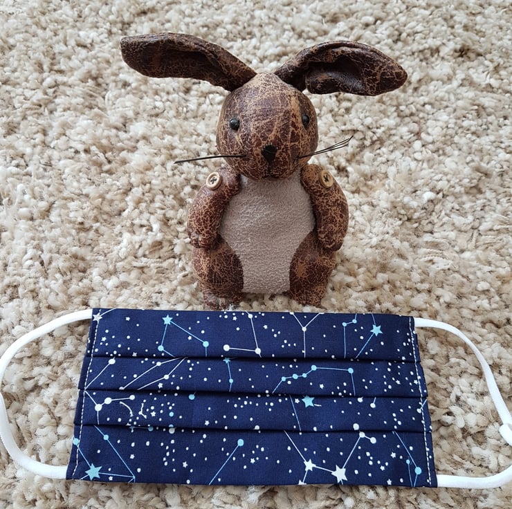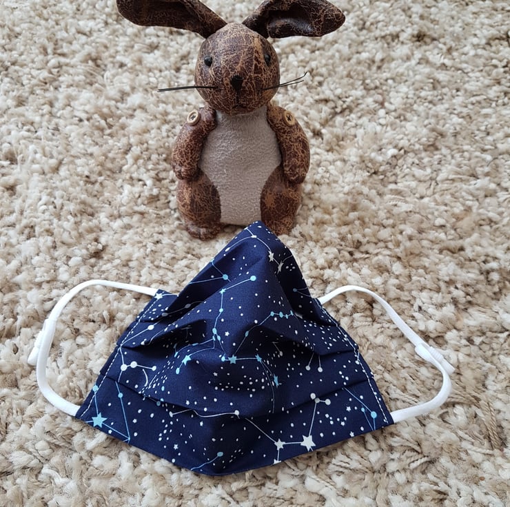 Adult face covering/mask made from a star constellation print on navy blue cotton. The face mask is made with 2 layers of cotton forming an inner pocket for a filter (not included) and is fastened over the ears with 2 loops of elastic.