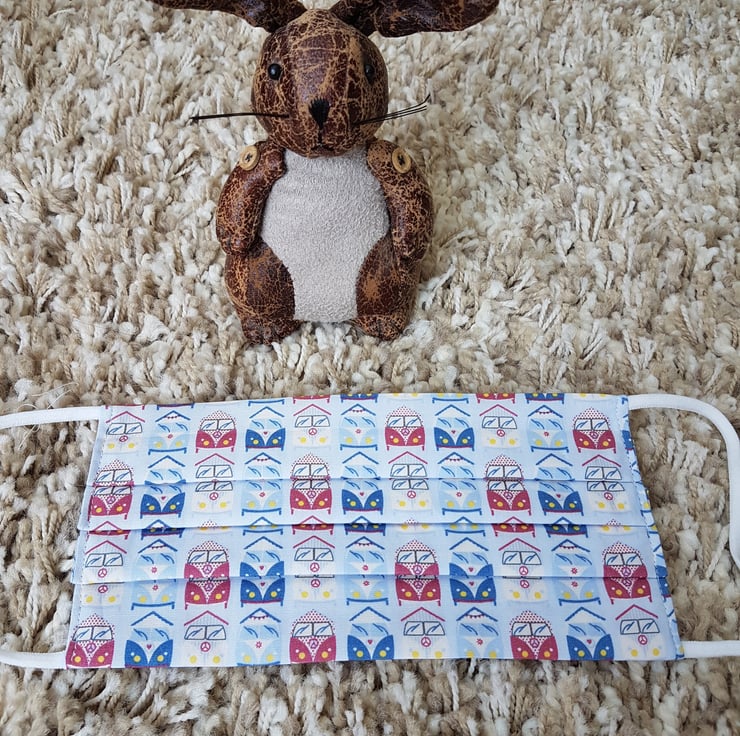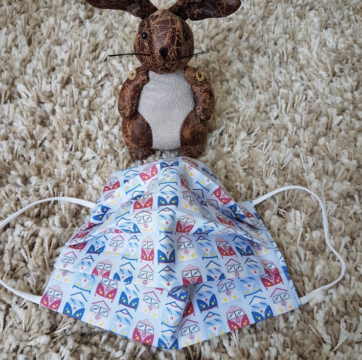 Adult face covering made from a colourful campervan print on blue cotton. The face mask is made with 2 layers of cotton forming an inner pocket for a filter (not included) and is fastened over the ears with 2 loops of elastic and a toggle adjuster.
