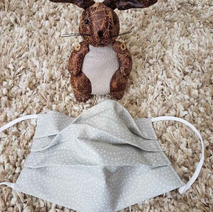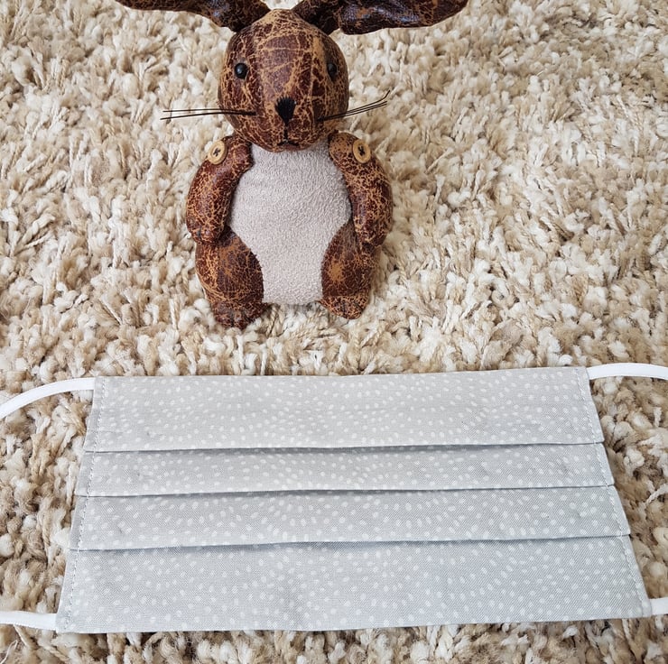 Adult face covering made from a twisty dot print on light grey cotton. The face mask is made with 2 layers of cotton forming an inner pocket for a filter (not included) and is fastened over the ears with 2 loops of elastic and a toggle adjuster.