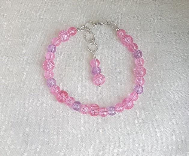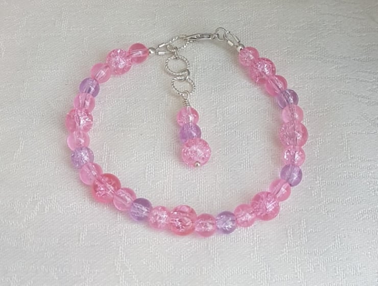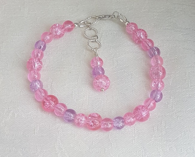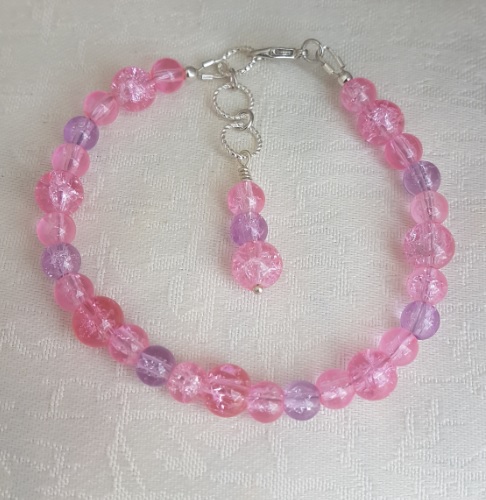 Pretty Pink bracelet made from candy colour crackle glass beads. Fab for those who love, love, love pink. This gorgeous bracelet is mainly pink but also has lilac crackle glass beads in its design. Lovely as a gift or as a treat for yourself.