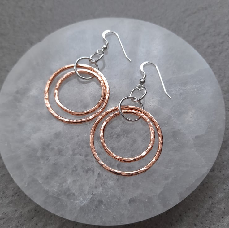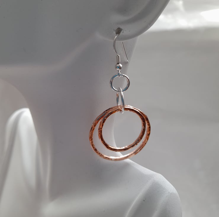 These earrings have been made out copper wire which has been formed into a circle soldered with silver solder and hammered to give texture and harden .The copper hoops have then been attached to sterling silver ear wires. The two copper rings have been attached separately (not been soldered together )so can move independently