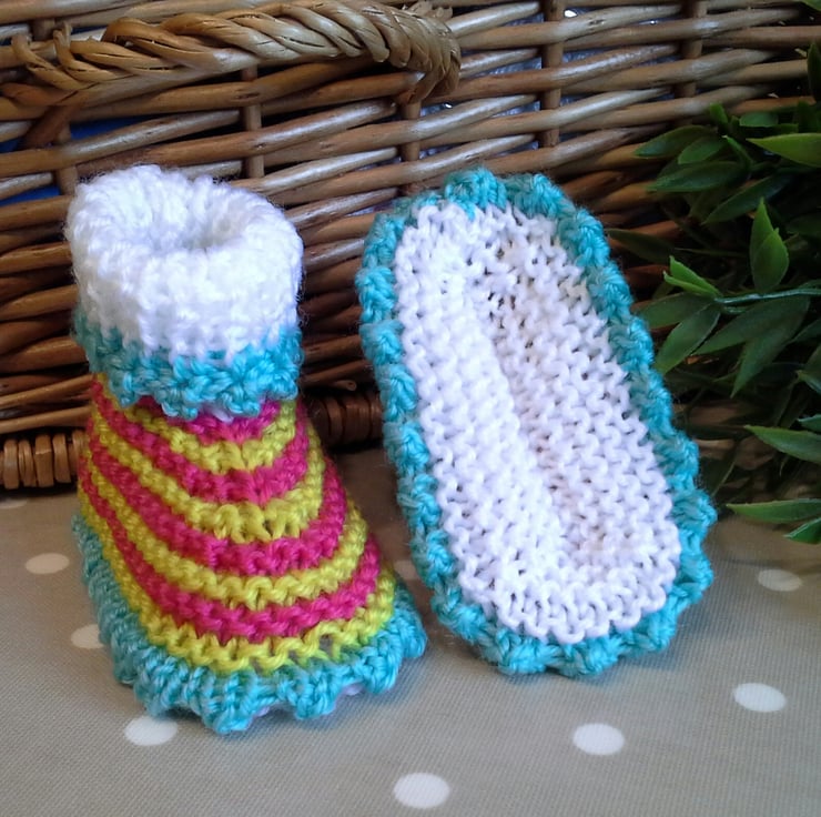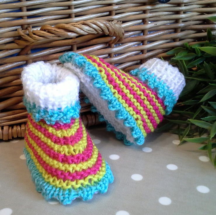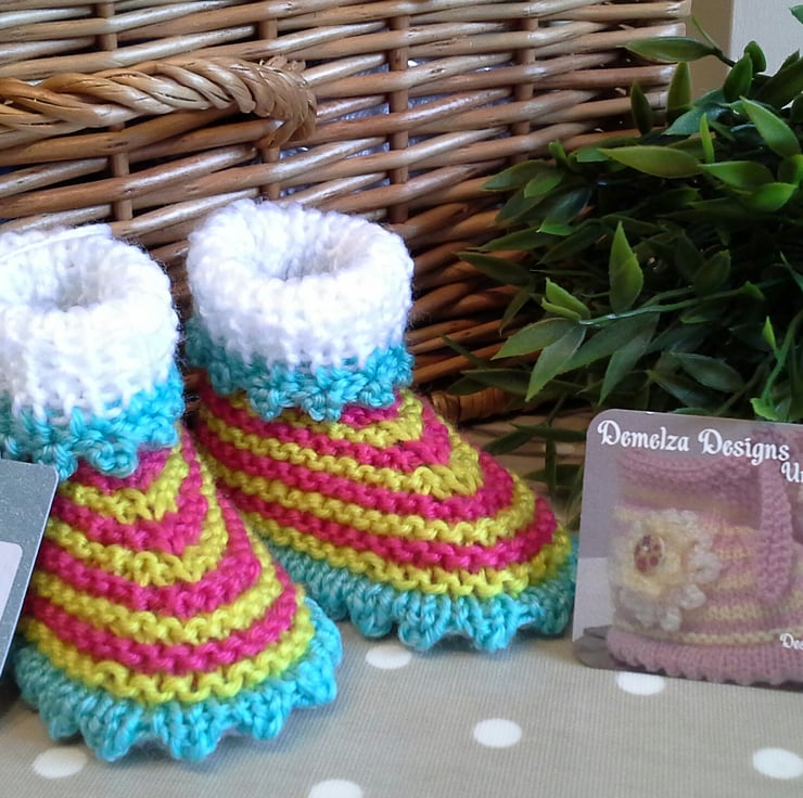 A sweet eye catching pair of booties designed and hand crafted using branded premium acrylic machine washable yarns. They will make a perfect token newborn gift for those working with a strict budget.