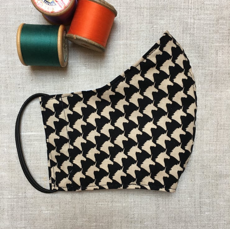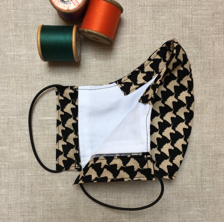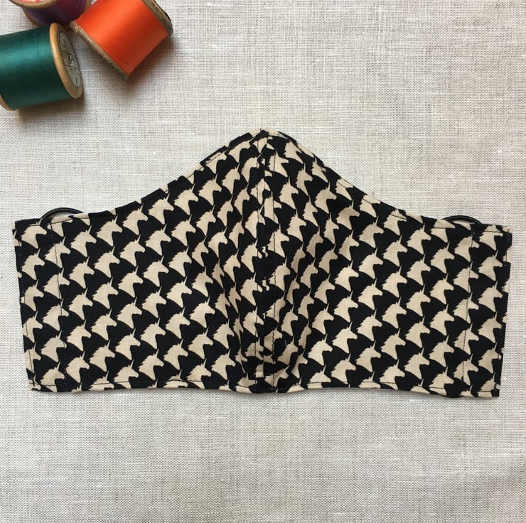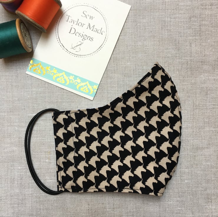This houndstooth print mask says fun with subtlety! It's made from 100% cotton and has been lined with 600 thread count cotton, making it extremely soft on the skin. This handmade mask is washable and reusable.