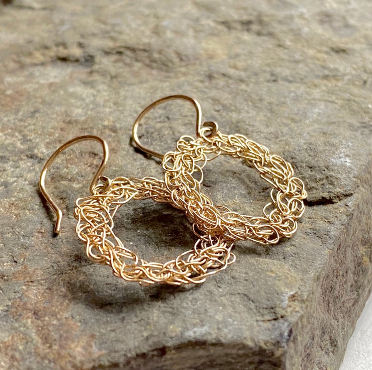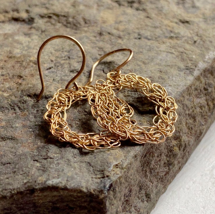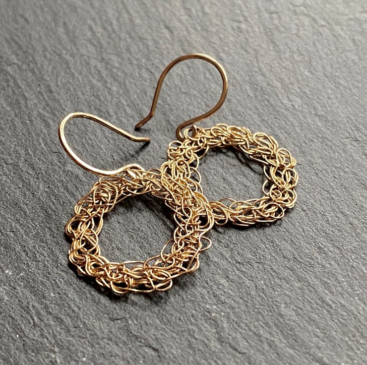 Crafted for those who crave individuality, these earrings are made from gold-filled wire and crocheted by hand with a needle-fine hook. Each circle is shaped with precision, very similar in form, but never identical. The raw beauty lies in the details: intricate, organic stitching that refuses to be replicated.