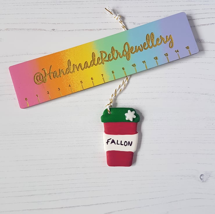 These gorgeous little Christmas colours coffee cup hanging decorations are the perfect present for the coffee lover in your life! Made from clay, then hand painted, any name of your choice is handwritten onto the centre of the piece, making it very special and unique! A teeny tiny glitter snowflake can also be added for extra effect!