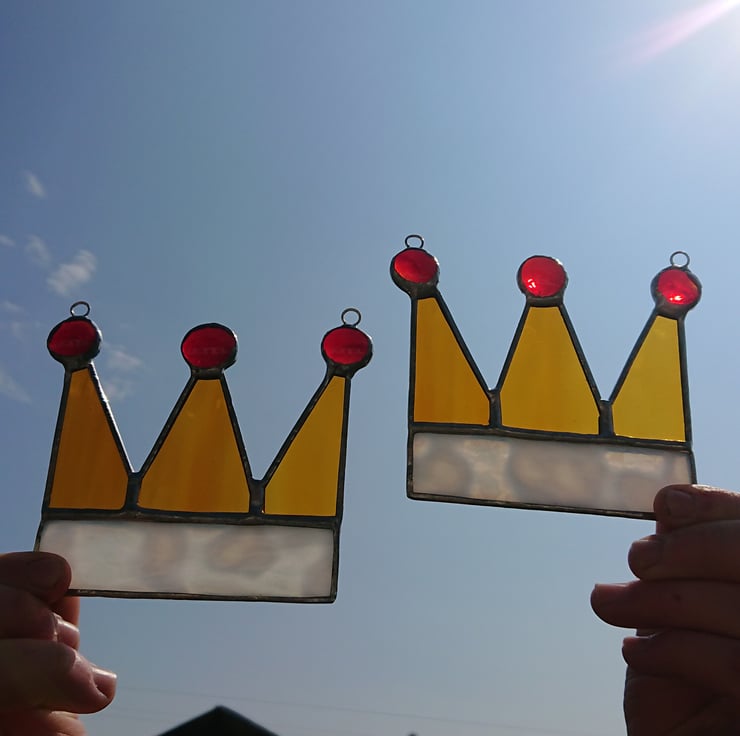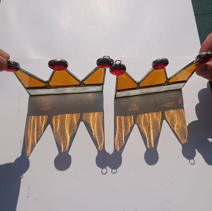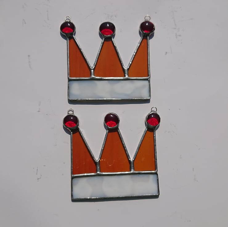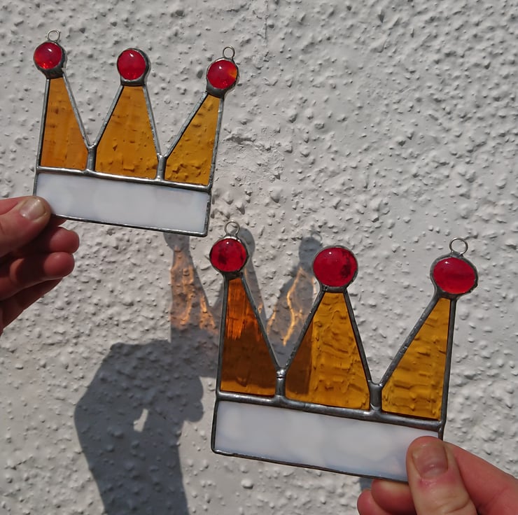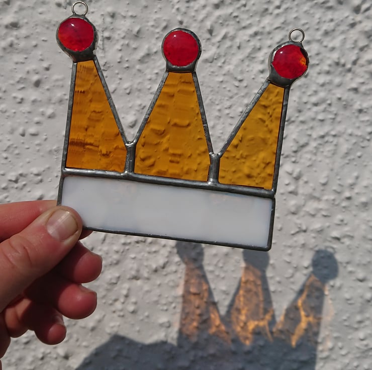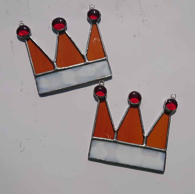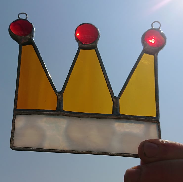 The fur rim of the crown has been represented by a lovely mottled white glass, softly rippled amber glass for the crown points and three transparent red nuggets for the jewels on top.