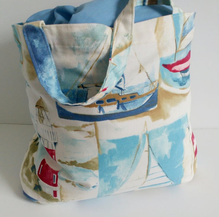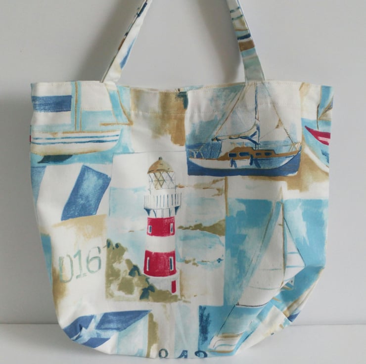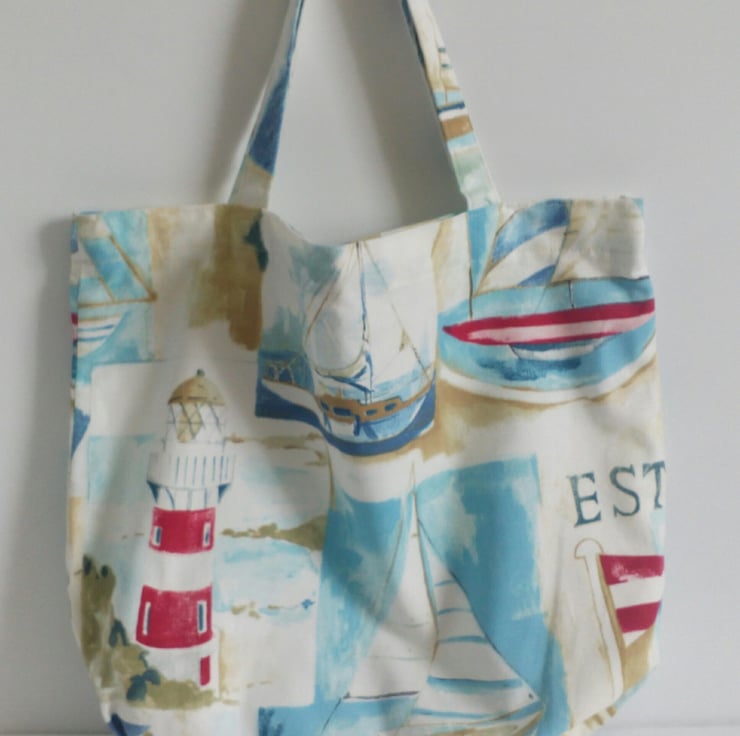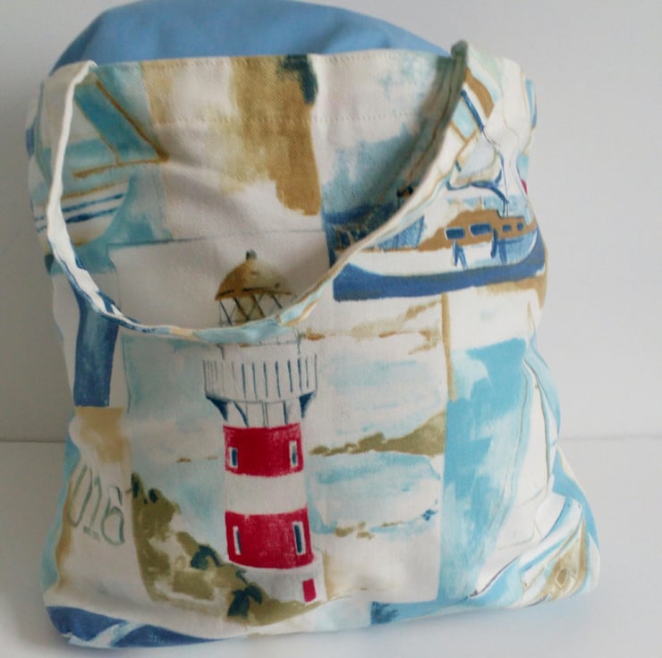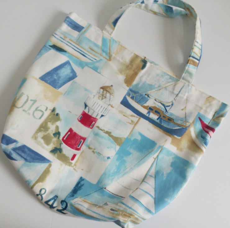 This is a shopping bag/tote with a Nautical/seaside print and a cream lining. It is made from upholstery/curtain fabric so is very sturdy. The handle is just long enough to hook over your shoulder.