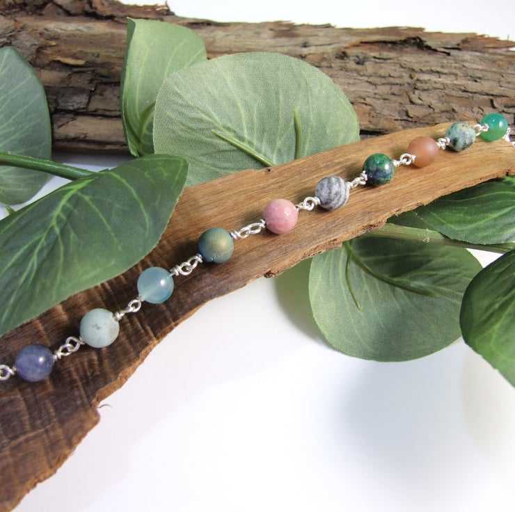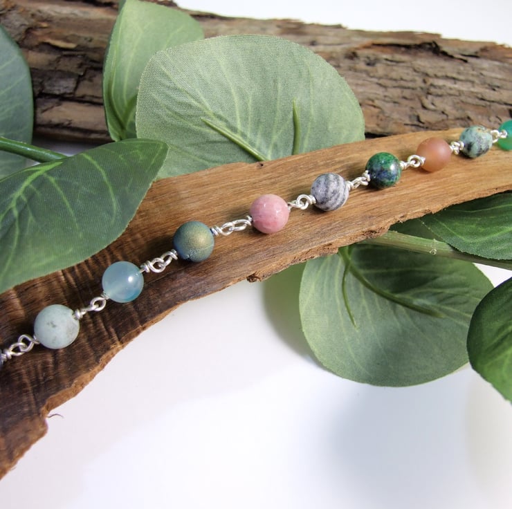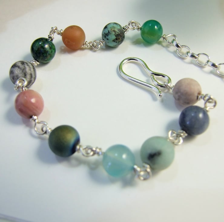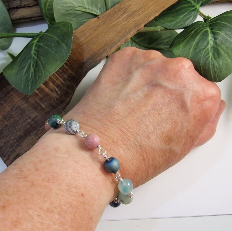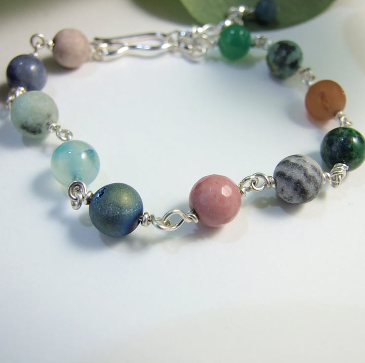 I have made the bracelet from a mixture of 8mm gemstone beads including Agates, Snowflake Obsidian, Rhodochrosite, Various Jaspers, Druzy Agates, Chrysocolla and Blue Aventurine. I have wired them securely together with wrapped wire loops and added my own handcrafted hook closure with a length of rolo chain.