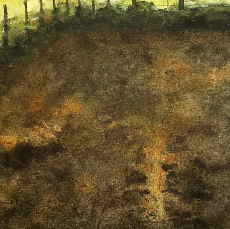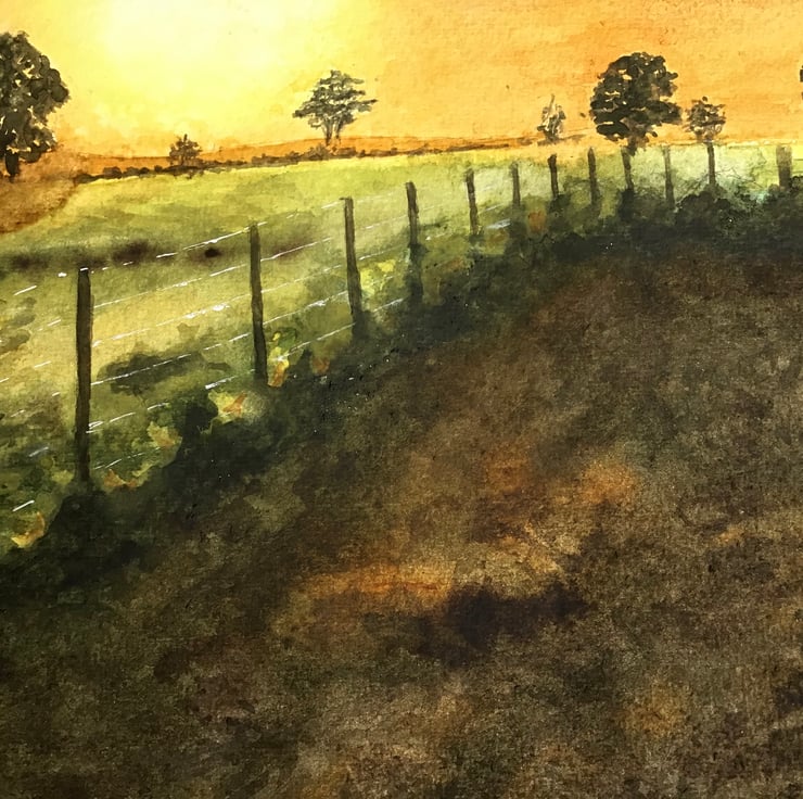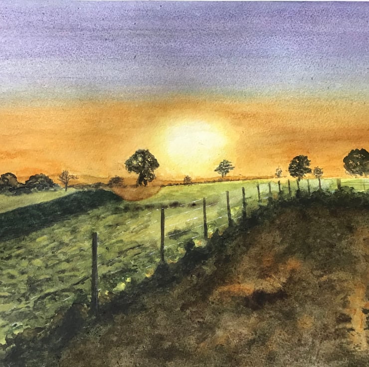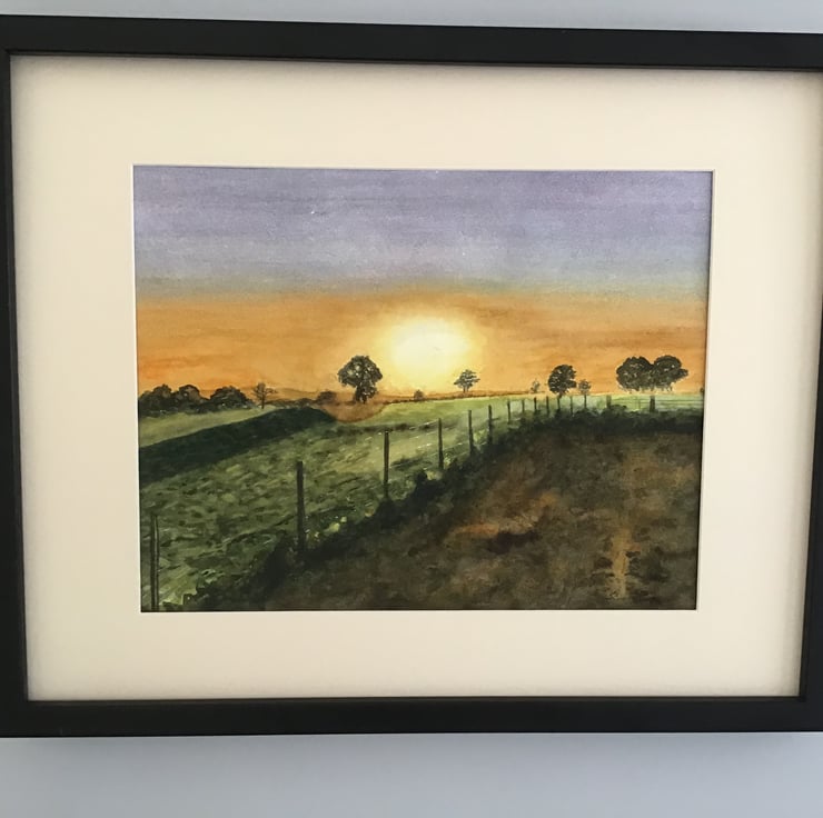 Original watercolour painting depicting a beautiful and atmospheric sunset over fields. Artwork measures 297mm x 420mm (A3) without mount, landscape orientation. Sold with mount but not framed.