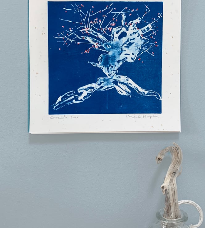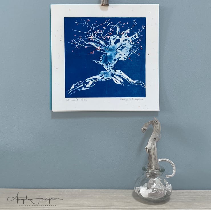 Beautiful ancient gnarled twisted trees and bleached driftwood were the inspiration for this cut and etched lino print. Admire Japanese woodblock prints and calligraphic lines. Wanted the ageing look but with new life in the blossom.
