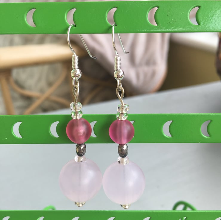 A pair of pink bead earrings, one large very pale pink frosted plastic bead with a smaller darker pink bead on top. These beads are spaced with clear seed beads and a lozenge shaped steel coloured metal bead. They are on a shepherds crook loop for ease of wearing. They are about 5cm in length. These pretty beads are very lightweight so these earrings are very comfortable to wear.