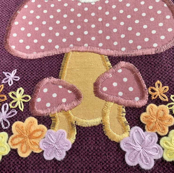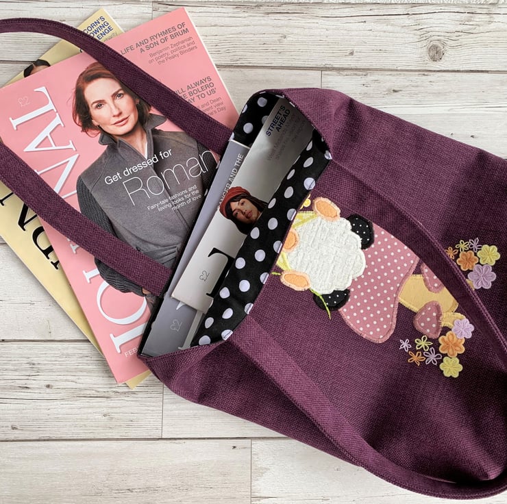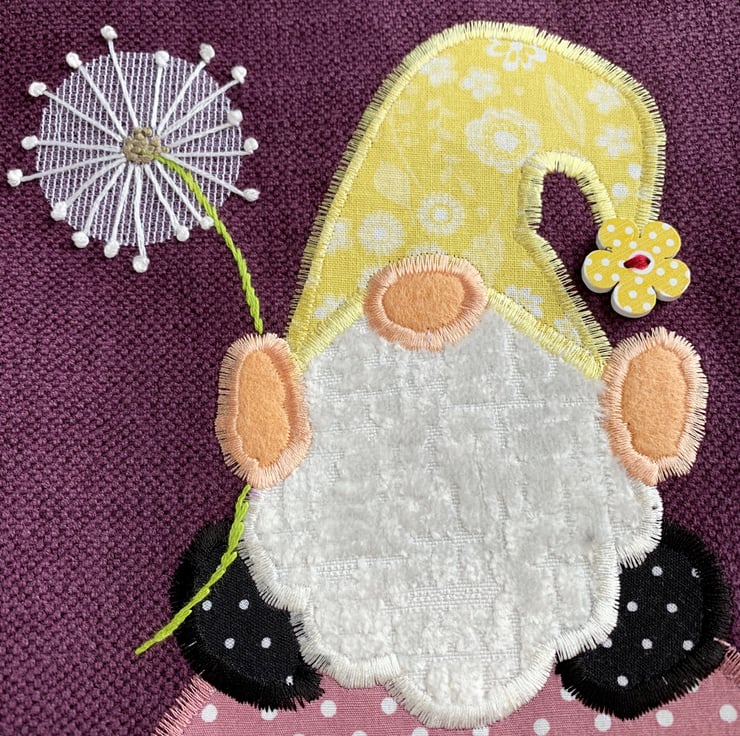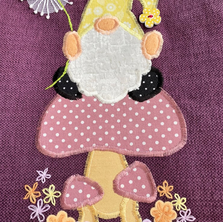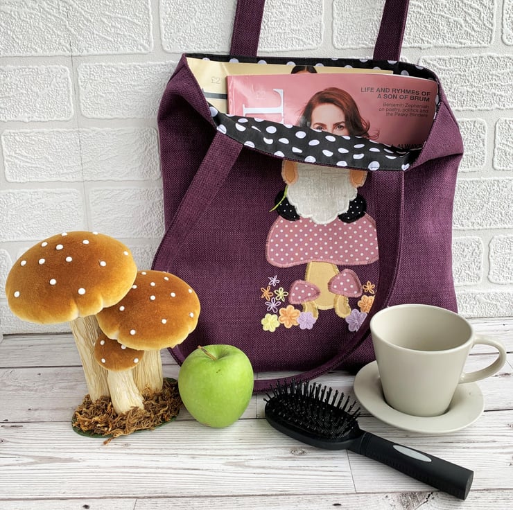 A purple tote bag with a cute appliqué Scandi gnome, sitting on a mushroom and holding a dandelion clock. The gnome, or Tomte, is wearing a mustard yellow hat with a white floral pattern and a pompom made from a yellow wooden flower shaped button. His shoes are black with tiny white polka dots. His beard is a white textured velvety fabric and his nose and hands are peach-coloured felt. I've hand-embroidered the dandelion clock on top of a piece of fine white net. The stem is also hand-embroidered. The gnome is sitting on a dusky pink mushroom with white polka dots. The stem is golden yellow. There are also two smaller mushrooms in the same fabric, surrounded by felt and hand-embroidered flowers in yellow, lilac and peach. The bag is lined with black fabric with white polka dots.