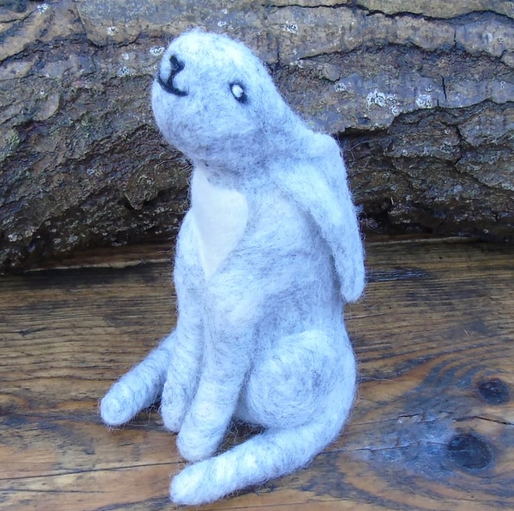 Made with 100% wool in a gorgeous multi toned grey and white for the chest. Using a sharp barbed needle I needle felted the wool into this beautiful hare.