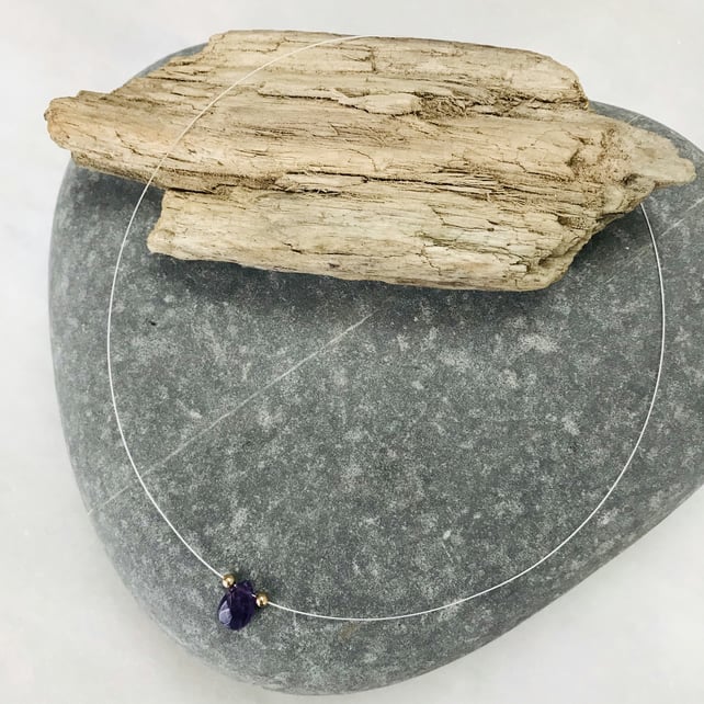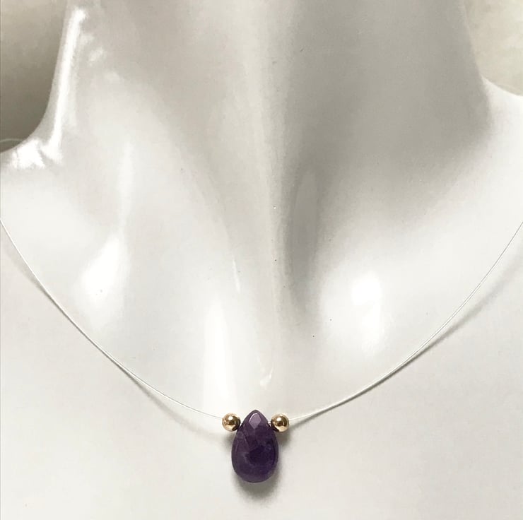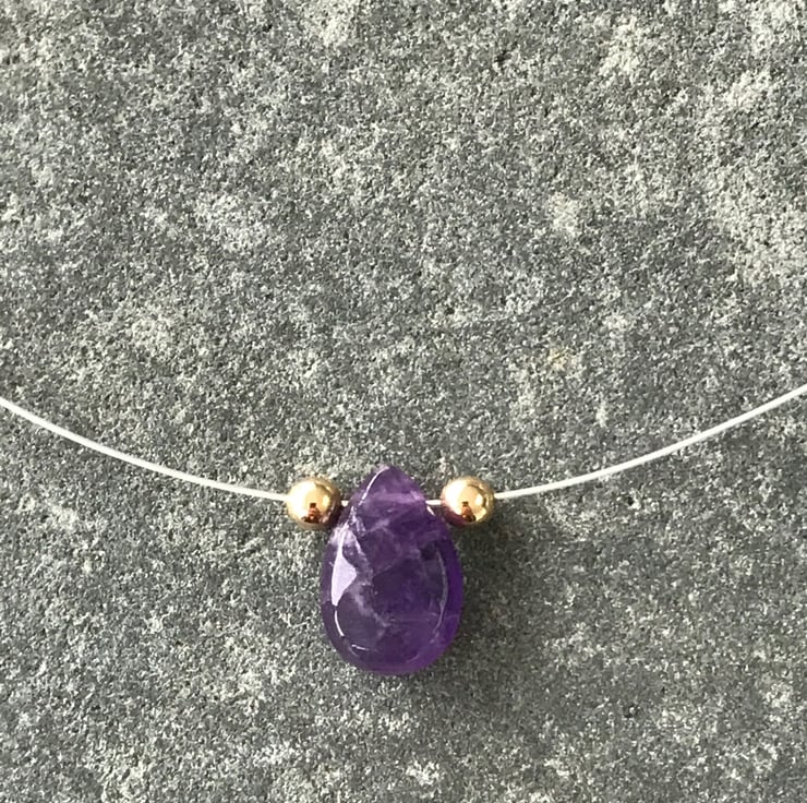Amethyst faceted gemstone bead necklace. The purple gemstone is complimented with 2 small gold filled round beads.