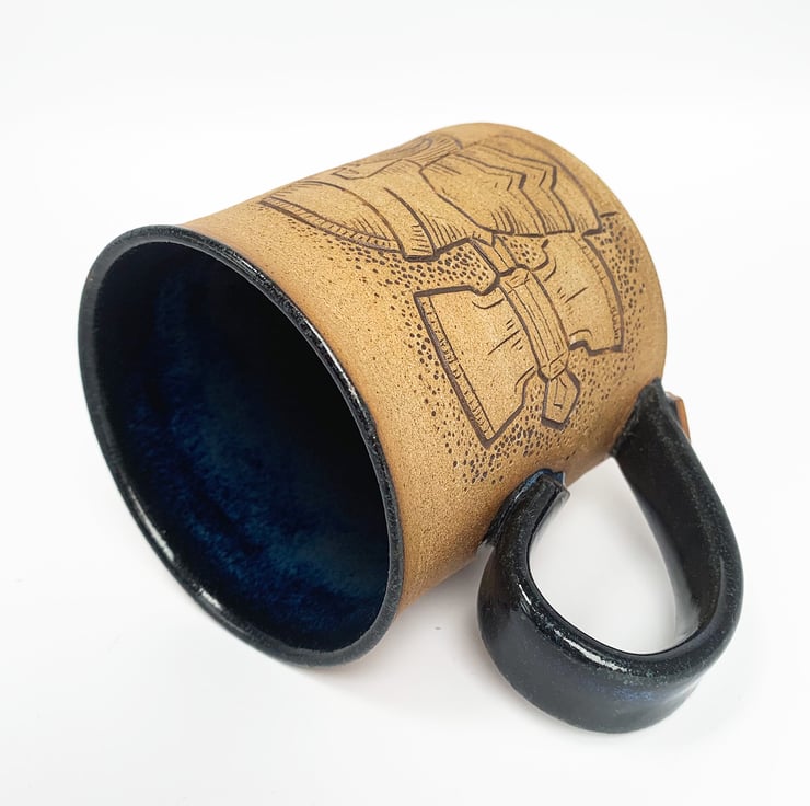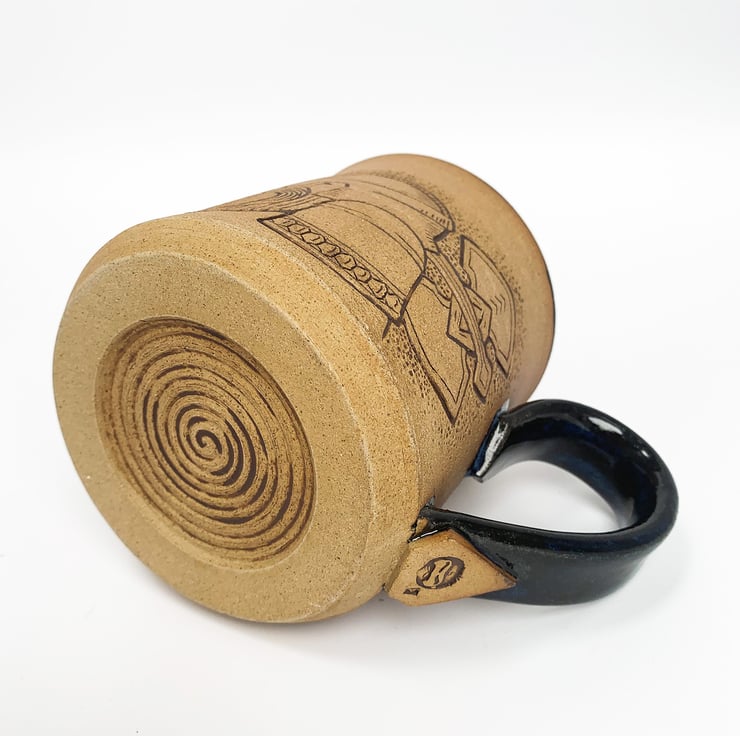 Wheelthrown and hand carved mug depicting two dwarven warrior guardians.