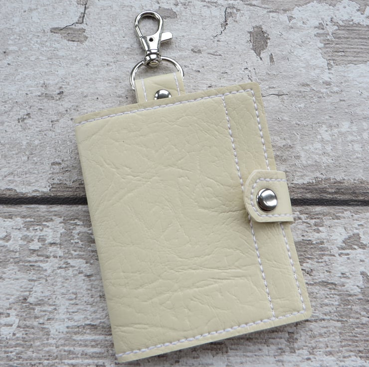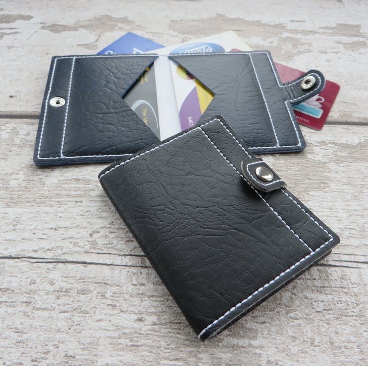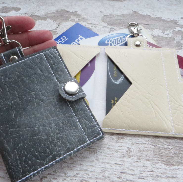 Centerfold bifold wallet with 2 pockets made from sturdy vinyl/leatherette in a variety of colours with a choice of fastening. These wallers are perfect for carrying your credit cards, store loyalty cards, travel Oyster cards or business cards safely and securely with style. Keep any type of card in place in this neat and functional wallet. The V-flap pockets allows 2-4 credit/store cards to be held comfortably. The wallet fastens with a tab and press stud button. You can choose to have a tab at the top of the wallet with a lobster clasp so you can attach the wallet to your bag, keys, belt, anywhere you choose and works great when you don't want to carry around a bulky wallet or purse. Keep it safe and handy, ready when you need it..