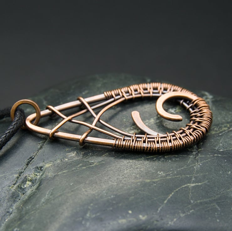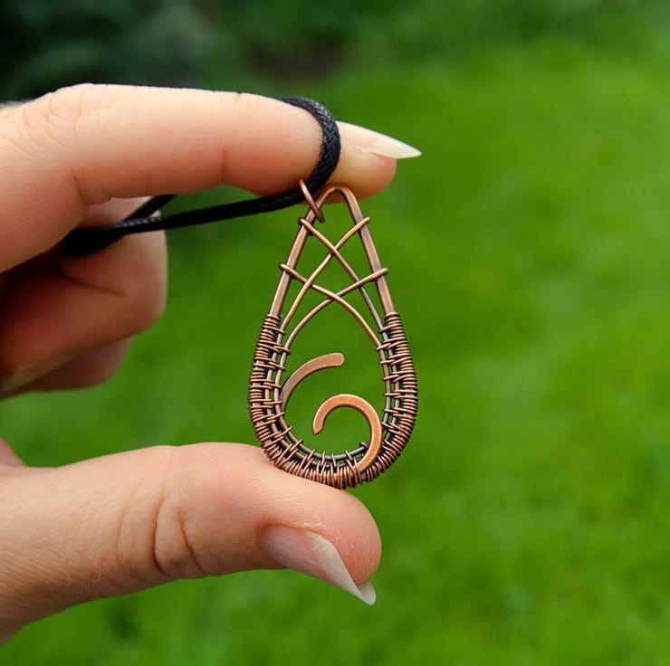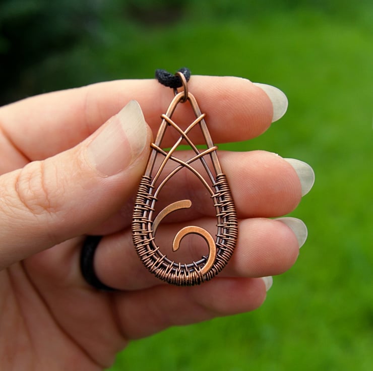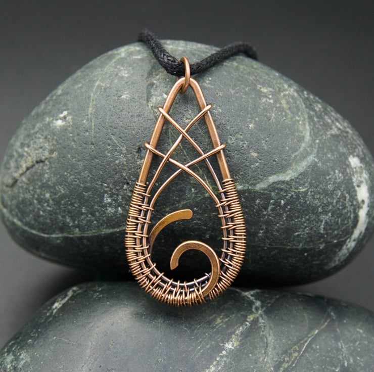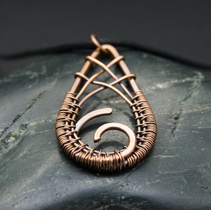 This unusual pendant has been completely handmade from copper wire. I've used thick wire to form the teardrop shaped frame of the pendant, with the ends curled in & hammered flat to create a spiral shape. Finer wires have been woven inside the frame, with the ends forming a criss-crossed detail in the top half of the pendant. It's a distinctive design that would be perfect for someone who likes their jewellery a little bit different!