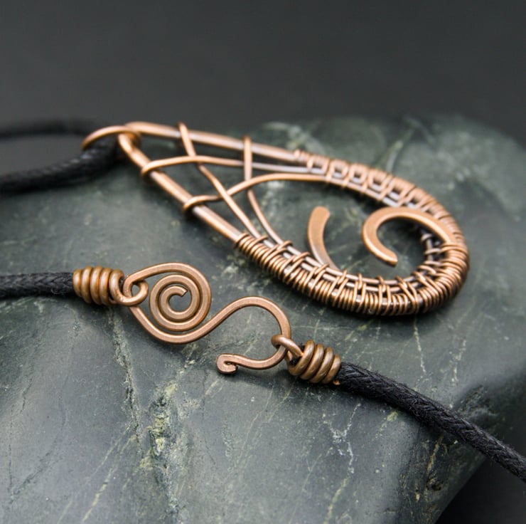 The finished pendant has been oxidised to bring out the lovely antiqued copper colour, & then lightly polished to highlight the hammered copper sections & the detail in the weave. It comes with a 2mm thick waxed black cotton cord, complete with handmade fastenings. The cord length is approx. 40cm but I can supply a different length if required - please let me know your preferred length via the 'choose options' button.