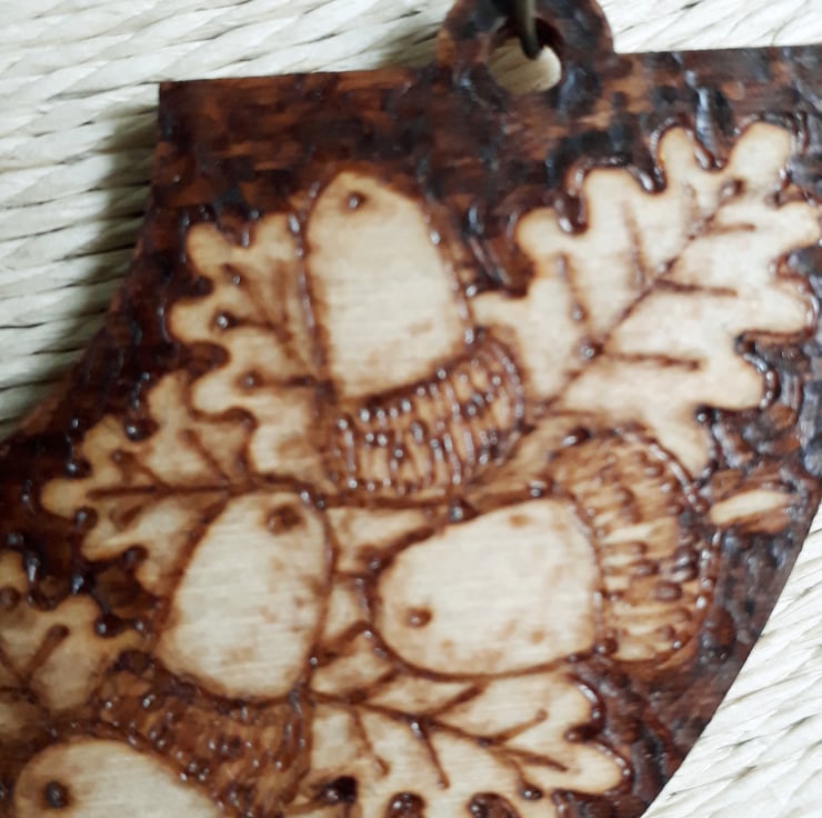 Wooden pendant illustrated with acorns & oak leaves using pyrography (wood burning).