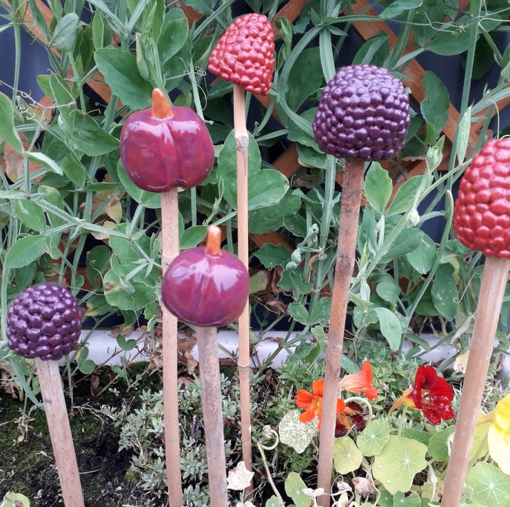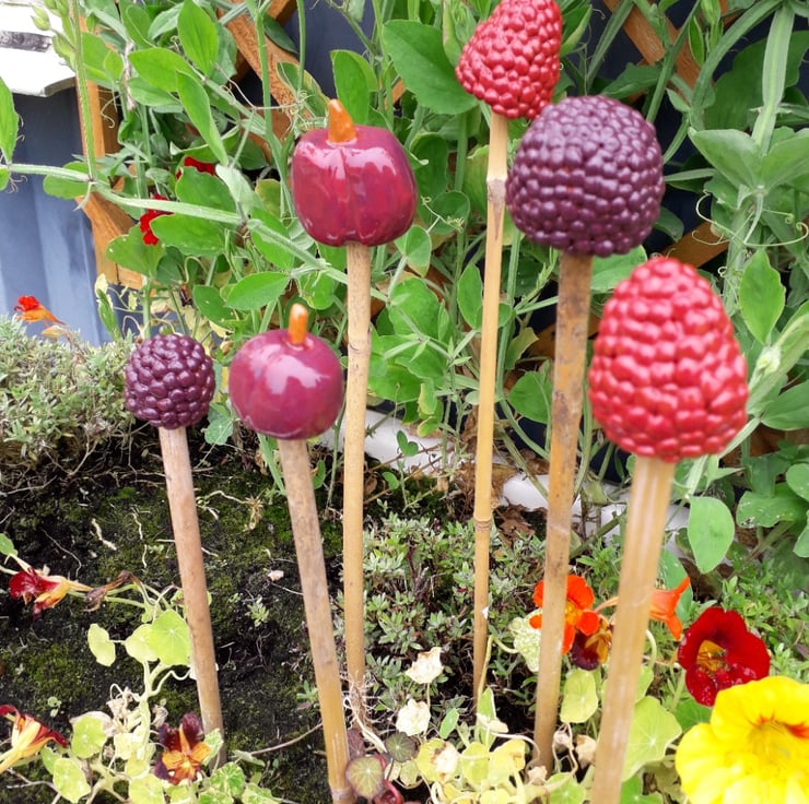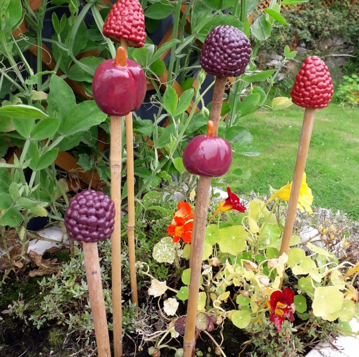 Cane Tops for your garden. Made from red earthenware clay, all glazed to suit the subject! Last for years and years in all weathers in your garden. This special collection consists of 6 cane tops of cherries, raspberries and blackberries - the latter two made with lots of patience rolling every tiny ball to create the berries - they turned out so well and they are unique. I use a variety of different bamboo canes to give a variety of hole sizes to fit bamboo canes.