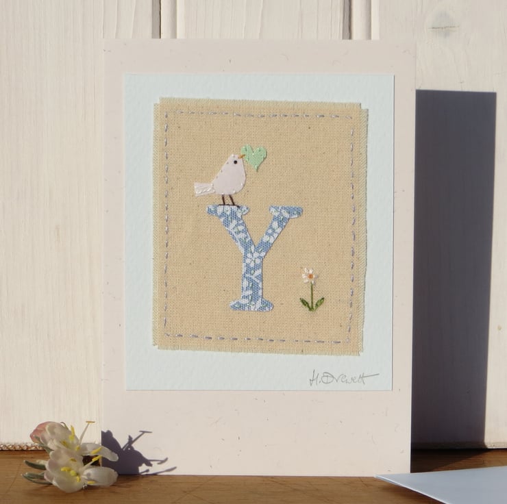 A hand-stitched card with the letter 'Y' cut from pretty blue and white fabric stitched into place with tiny stitches. I have added a miniature applique dove with heart in her beak, and then embroidered a tiny daisy flower to complete the design.