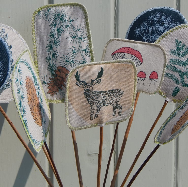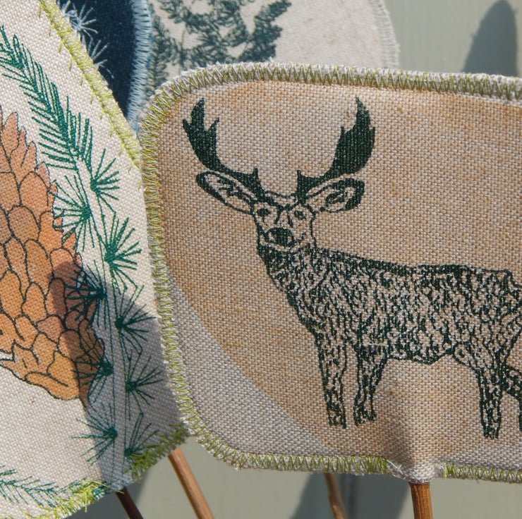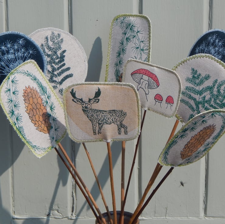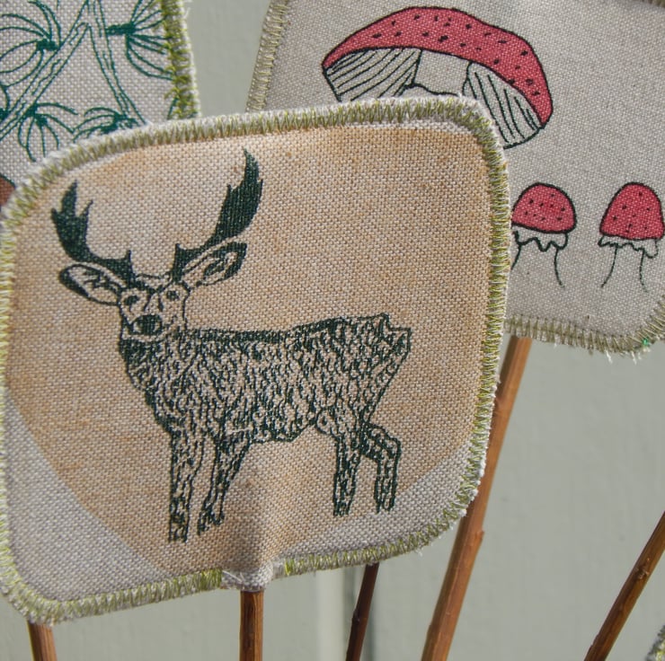 There is one stag that is screen printed on a very simple lino brown print, he measures 12cm by 10cm. There 3 are pine cones and pine tree branches that are screen printed and then hand painted to make the cones pop with colour. There are 2 designs and they measure approximately 15cm by 9cm. There is one toadstool, screen printed and then lino printed with red 10cm by 8cm, 2 bracken and 2 white dandelion clocks screen printed on a very dark green denim.