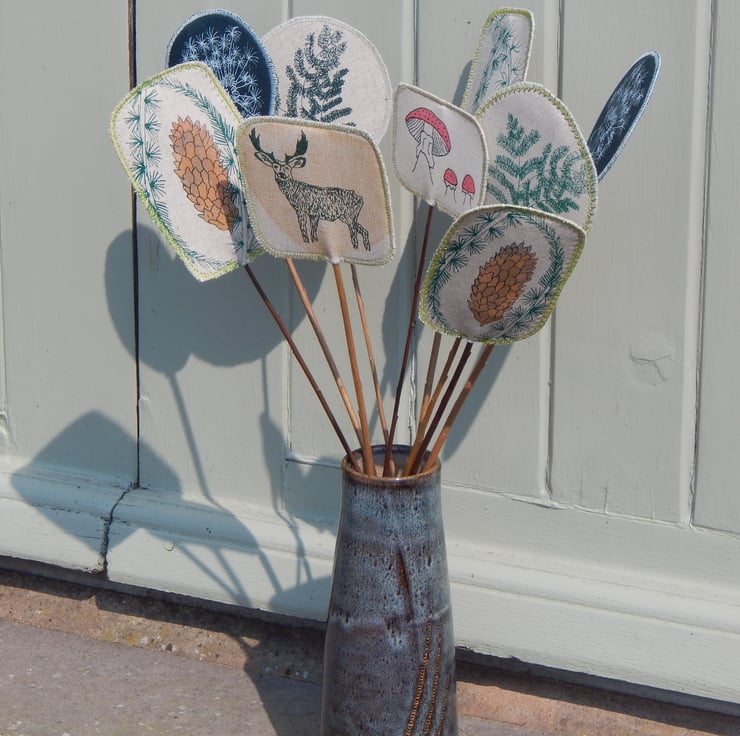 This is a bouquet of 9 fabric on willow creations. Each is double sided with interfacing for stability. They are all have running stitch and then a zig zig stitched finishing to ensure fraying is kept to a minimum. They are then hand glued onto willow which measures about 40 cm in length.