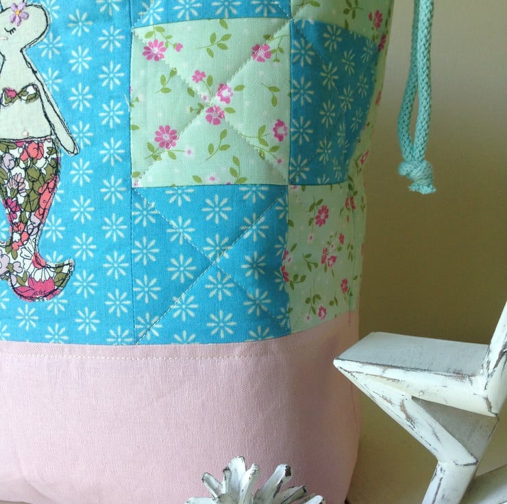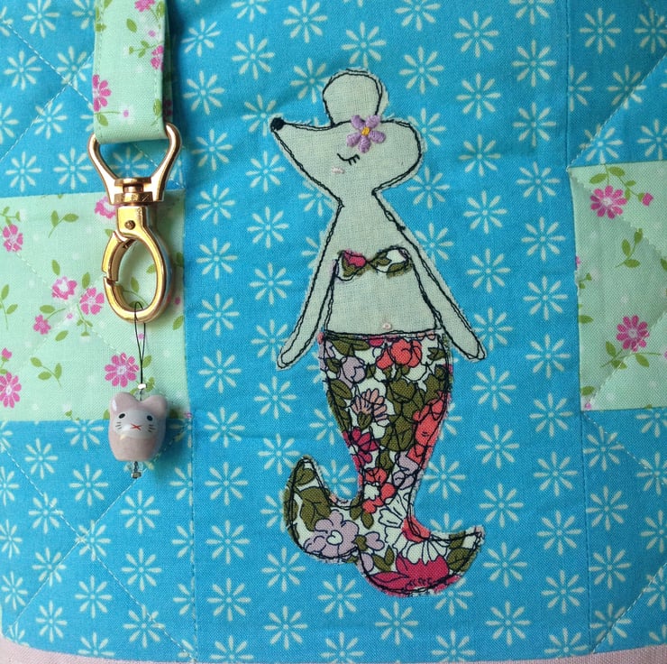 It features Matilda the Mermouse on the front. Who has been free motion embroidered using pretty fabrics by me.