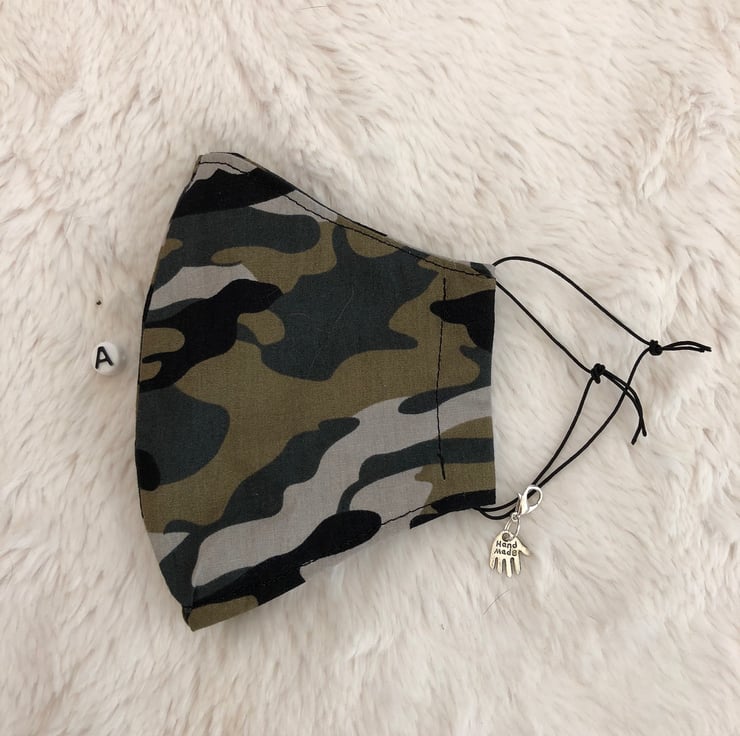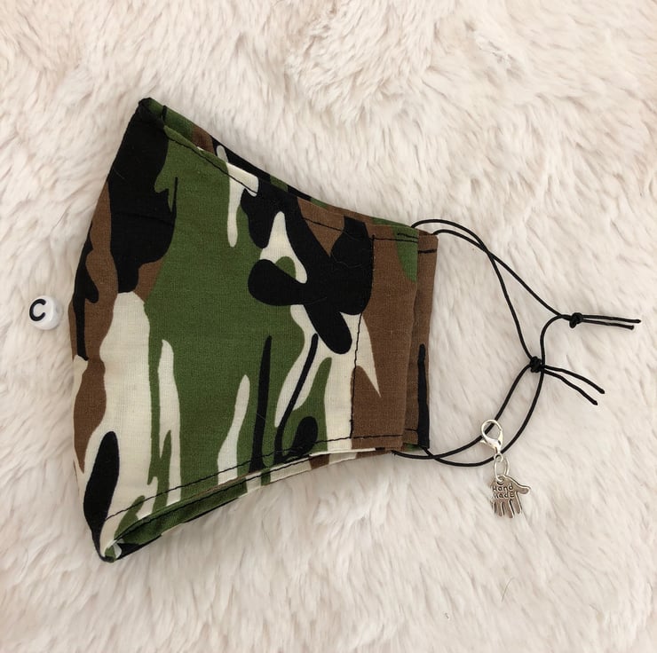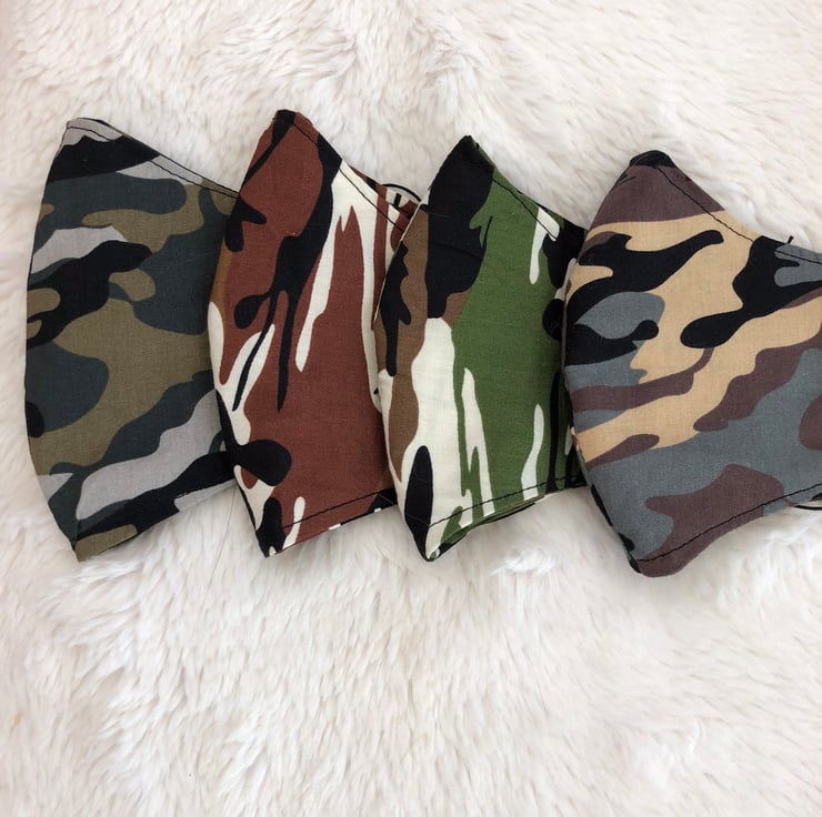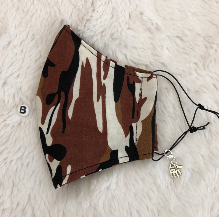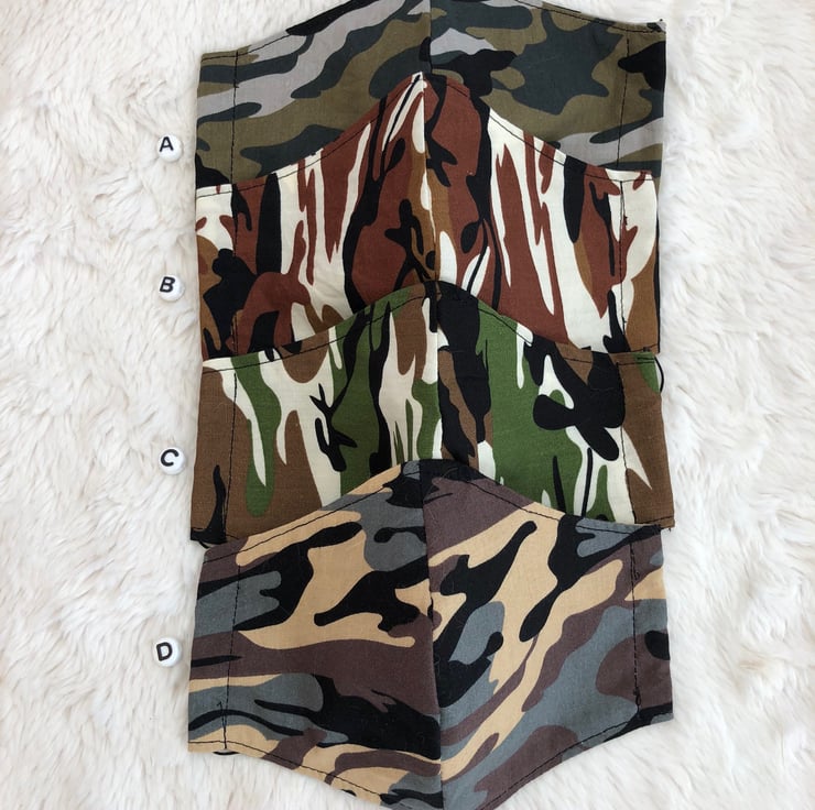 These handmade face masks are made in a double layer of 100%Cotton.They are washable,breathable and reusable.They have thin adjustable elastic ear loops.Just untie and hide knot in side seam.They come in 4 different camouflage designs.Please see my little shop for more colours and pattern designs.A: Sage Green/Grey.B:Brown.C:Green.D:Grey/Beige