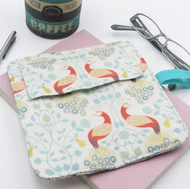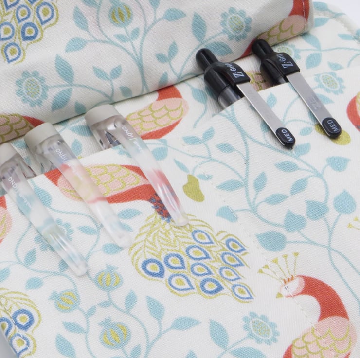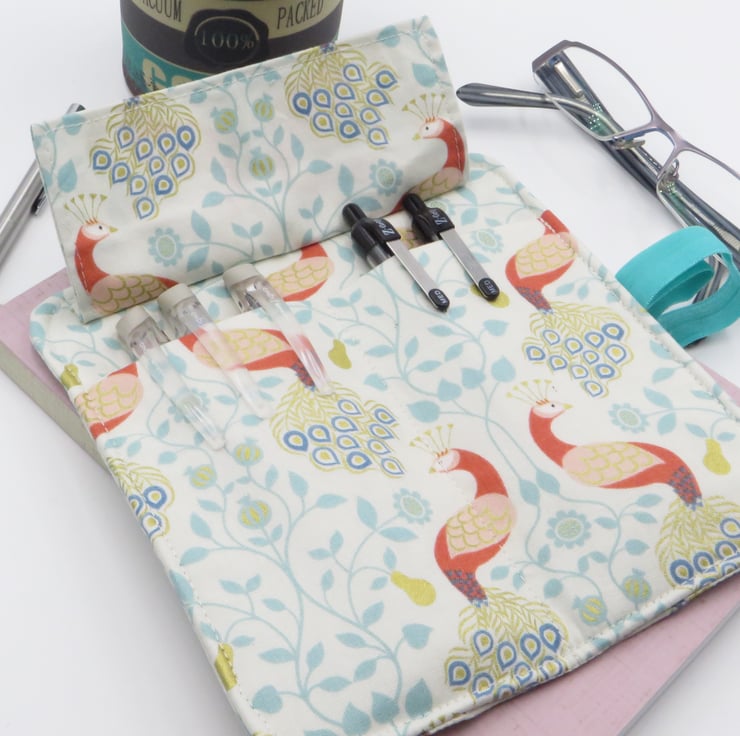 Made from beautiful cotton fabric it is lined with soft interfacing to give it shape, structure and a padded feel. The inside has an inner flap which folds down over your items keeping them safe when you're on the move. Sewn down the middle of the case gives you two pockets either side with ample space to store your pens or small tools . A complementary band of fold over elastic (FOE) wraps around the case when closed keeping your pens right where you need them.