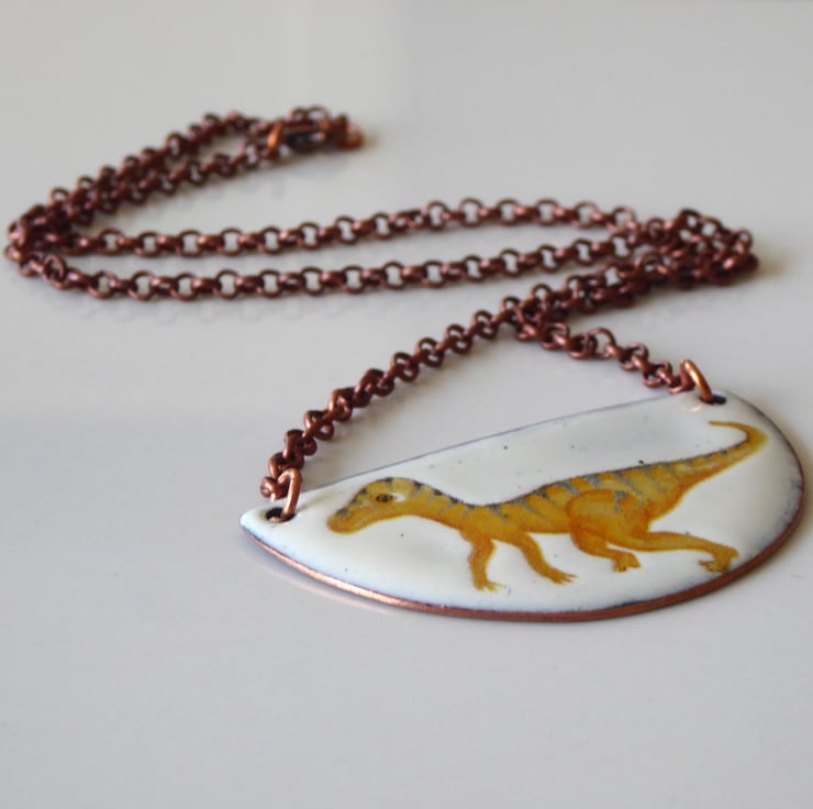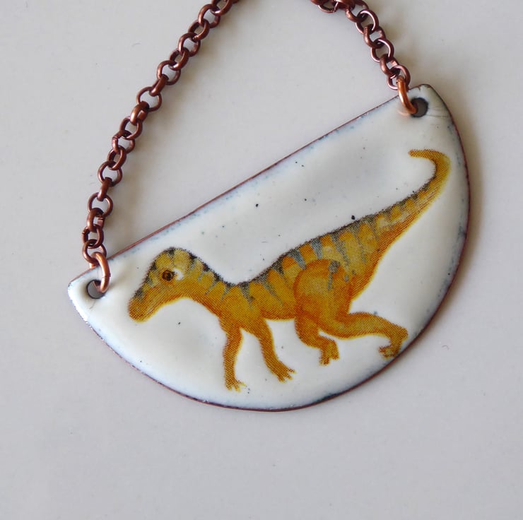 Enamelled copper necklace, with a cute orange coloured velociraptor on an ivory coloured background. The plate measures 55mm across the top and is 30mm deep. It is counter-enamelled on the back and the chain is made of copper-plated steel.