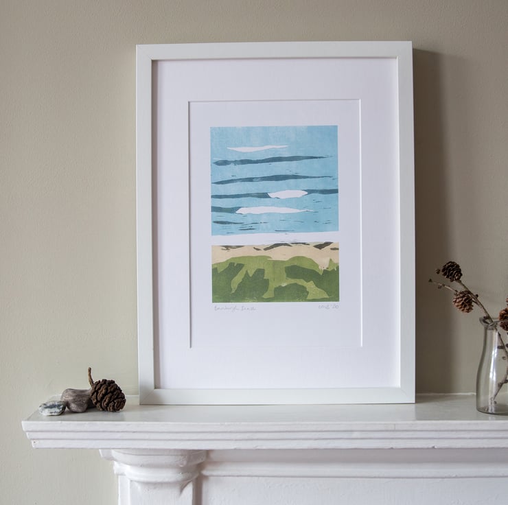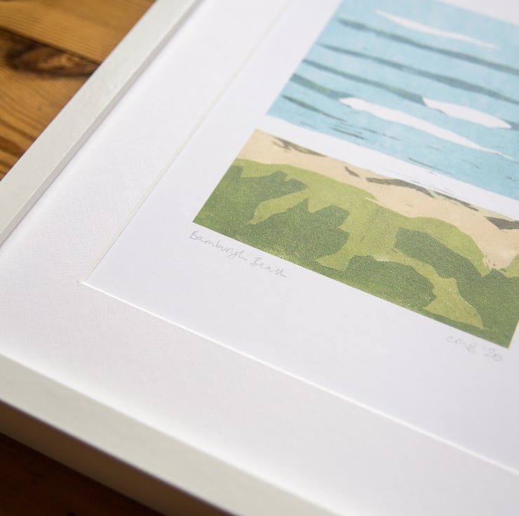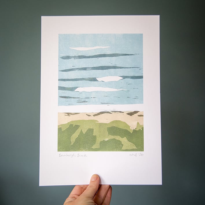 During the 2020 lockdown one of the things I missed most (apart from family, friends and the pub) was the beautiful beaches of Northumberland! I've had this project in my head for a few years but the coronavirus lockdown gave me the kick up the backside (and time) to get on with it! I drew sketches from pictures on my phone, then made them into original reduction lino prints (where you print a layer of colour, then cut into the lino again - and repeat - until the prints's complete). This is a high quality scanned digital print of the original