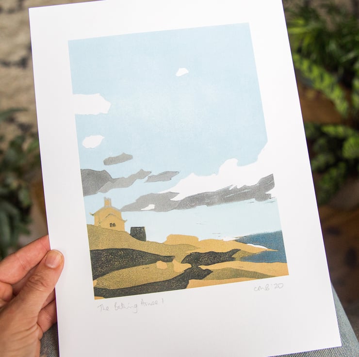 During the 2020 lockdown one of the things I missed most (apart from family, friends and the pub) was the beautiful beaches of Northumberland! I've had this project in my head for a few years but the coronavirus lockdown gave me the kick up the backside (and time) to get on with it! I drew sketches from pictures on my phone, then made them into original lino prints (where you print one colour layer, then cut into the lino again - and repeat - until the print is complete). This is a high quality digital print of the original
