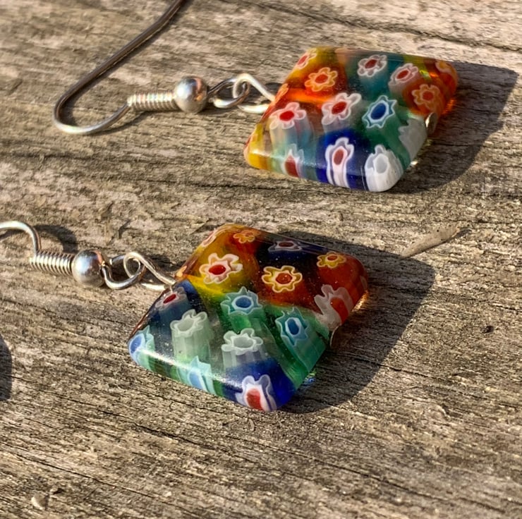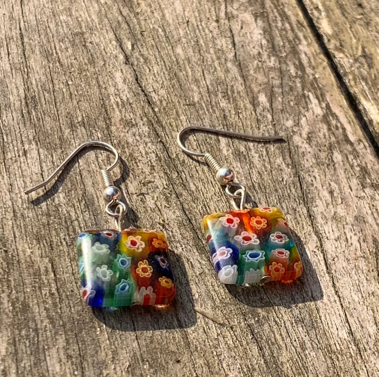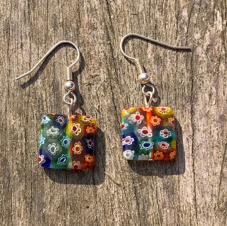 Rainbow Millefiori Beads flower glass beads hung from silver plated earring hooks and silver plated findings.