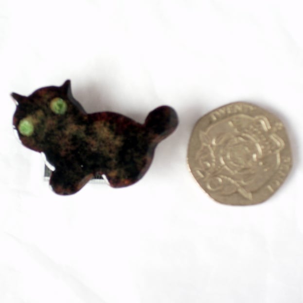 This kitten measures 34mm from the tip of its left ear to the tip of its tail, 23mm from ear-tip to paw. I have soldered it on a 20mm brooch bar. The brooch pin fastens with a simple catch.