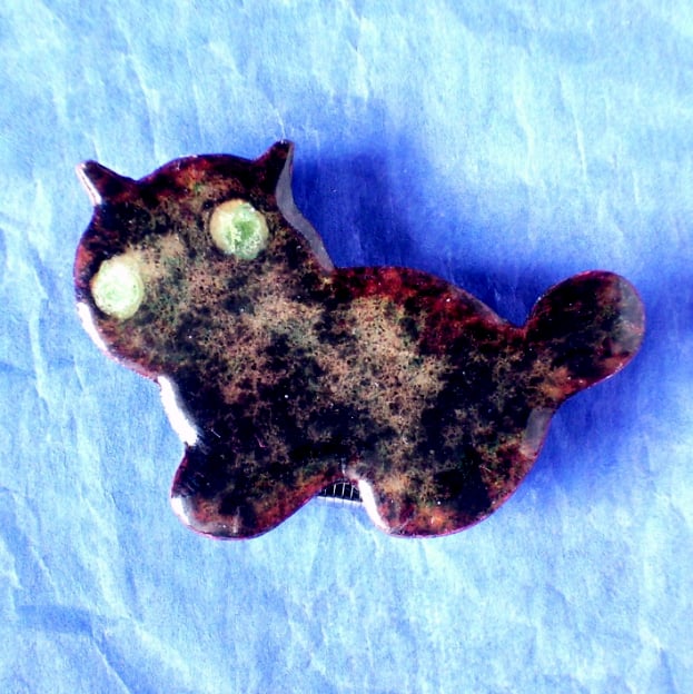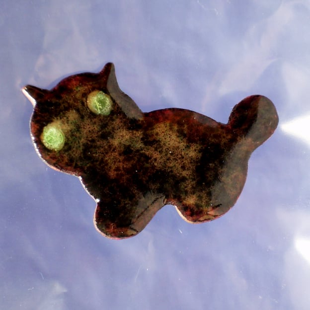 A layer of black enamel over a clear enamel base. Two small green beads for eyes. The black layer is thin and so the copper base shows through, shimmering golden brown, giving a tabby effect.