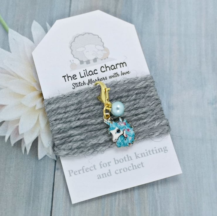 Blue Unicorn Head Stitch Marker. Perfect for knitting and crochet.