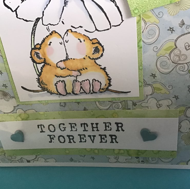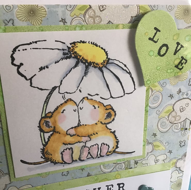These cute mice are hand stamped and coloured with Promarkers. A heart shape with Love has been added, along with two small metal hearts.