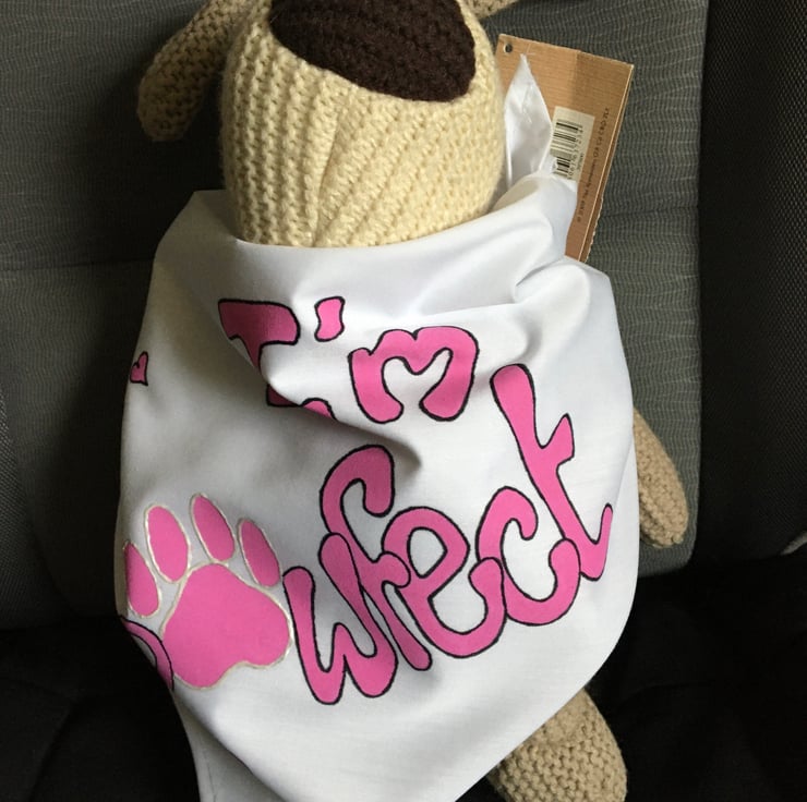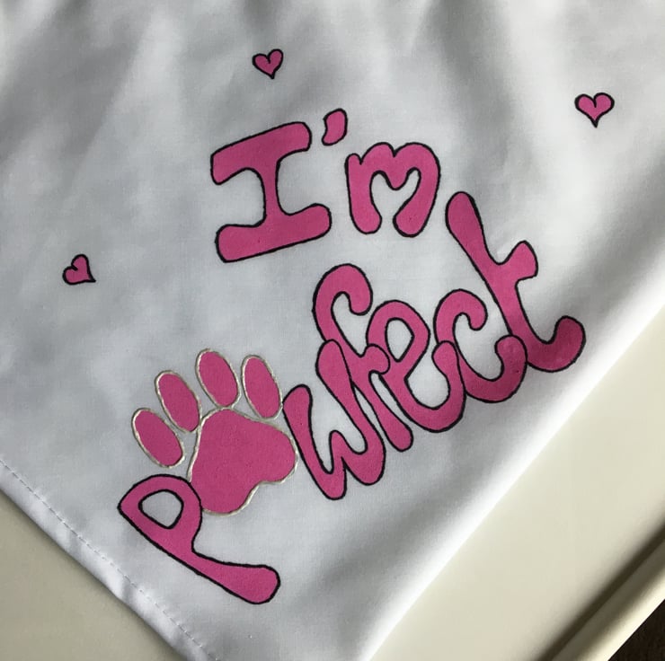 This is a hand painted medium size dog bandana, entirely designed by me. It has a pink writing and three little hearts, bordered in black. The paw is bordered with a 3D pearl fabric pen.