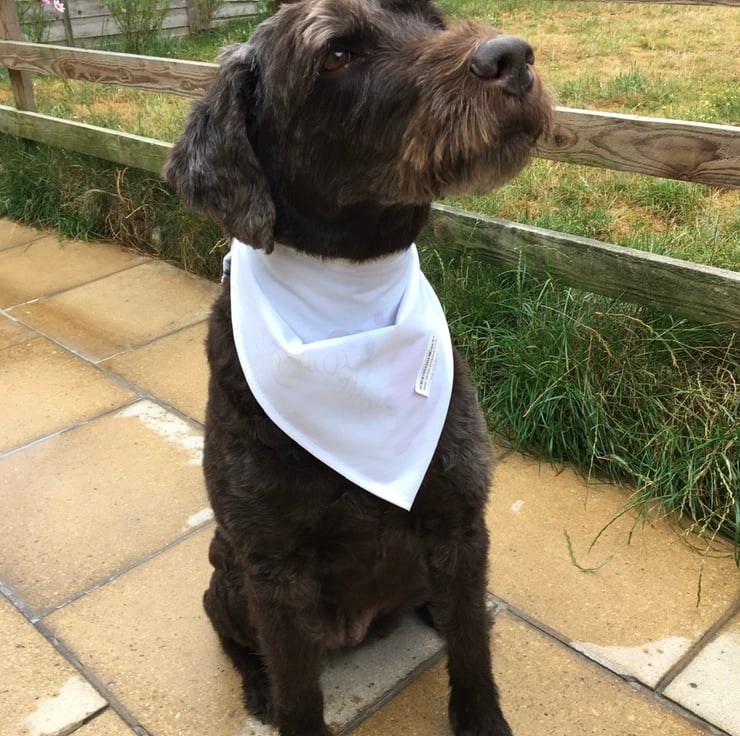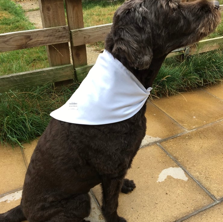 The side that would go around the neck measures approximately 60cm (23.6 inches), so it would fit a small medium sized dog (it closes with a knot). The dog in the picture (one of my pawfect dogs) who very kindly modelled for me, is a Labradoodle girl, and the bandana fits her just fine. The bandana on sale has not been worn by any of my dogs.