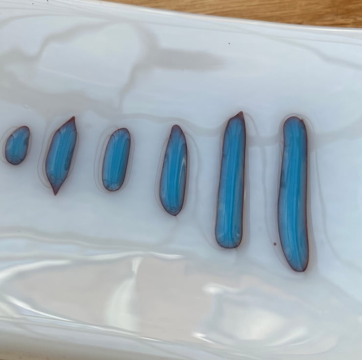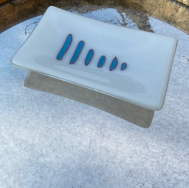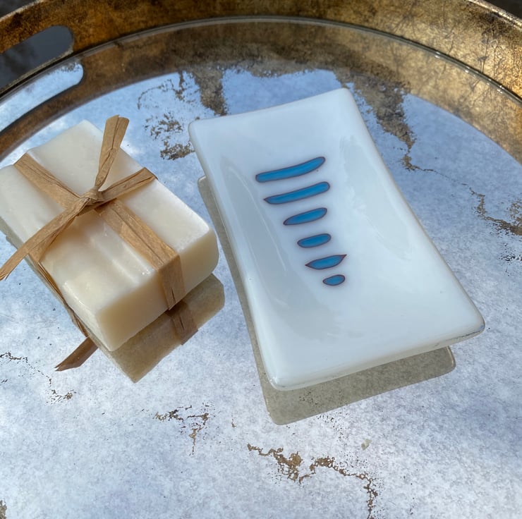 This shallow dish is made with white reactive glass and cyan blue accents which, when fused together, produce a lovely effect.