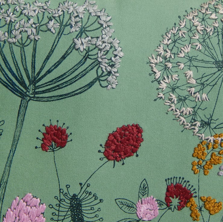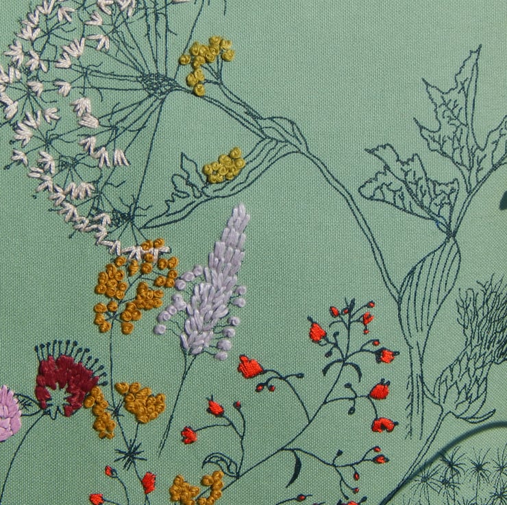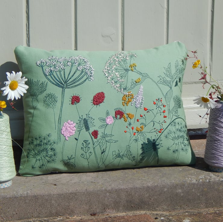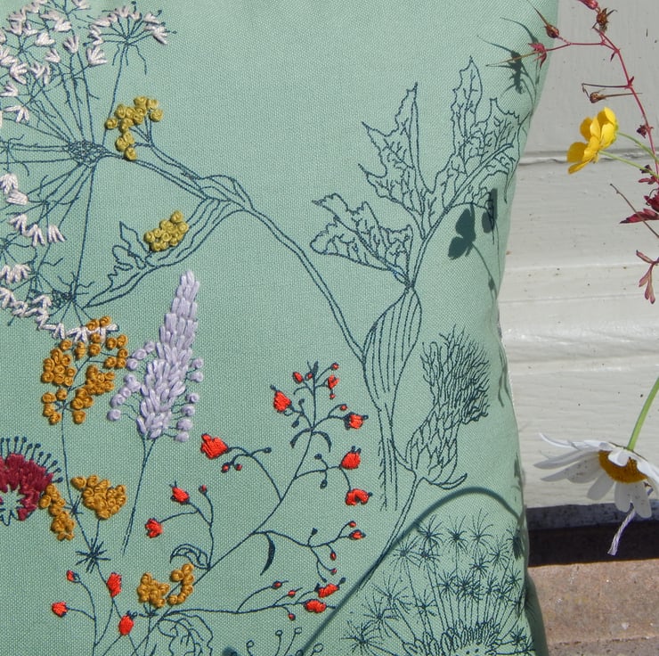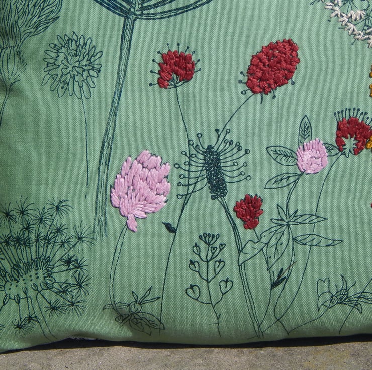I have used one of my main screens for the middle of the cushion and waited for this to dry. There are then lots of wild flowers each printed individually with my smallest size screens, I place the screen, print, wait to dry and then place and print the next one. This gives a real individual one of a kind never to be repeated design, unique to this one cushion. The flowers include dandelion clocks, cow parsley, plantain, dock leaf, scabious and thistle. Many of these are hand embroidered to make them pop with colour.